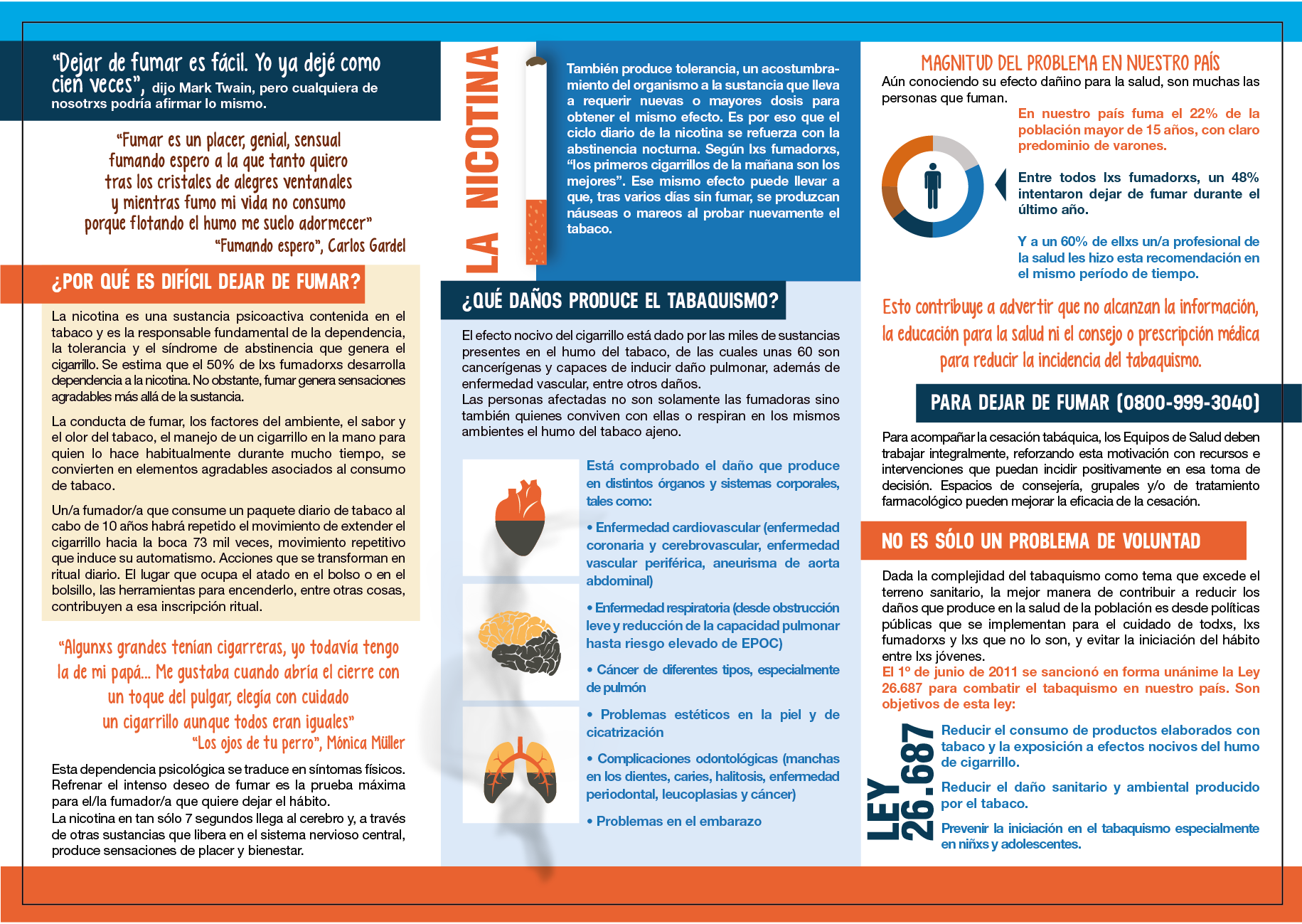 De esta manera el tema se hace presente en las acciones para el cuidado de la salud y diferentes interlocutores pueden ser quienes ofrezcan la posibilidad de que el tema concite interés para la persona fumadora que acceda a hablar de ello, o se quede pensando luego de la intervención en la posibilidad de la cesación, aunque eso no sea inmediato.