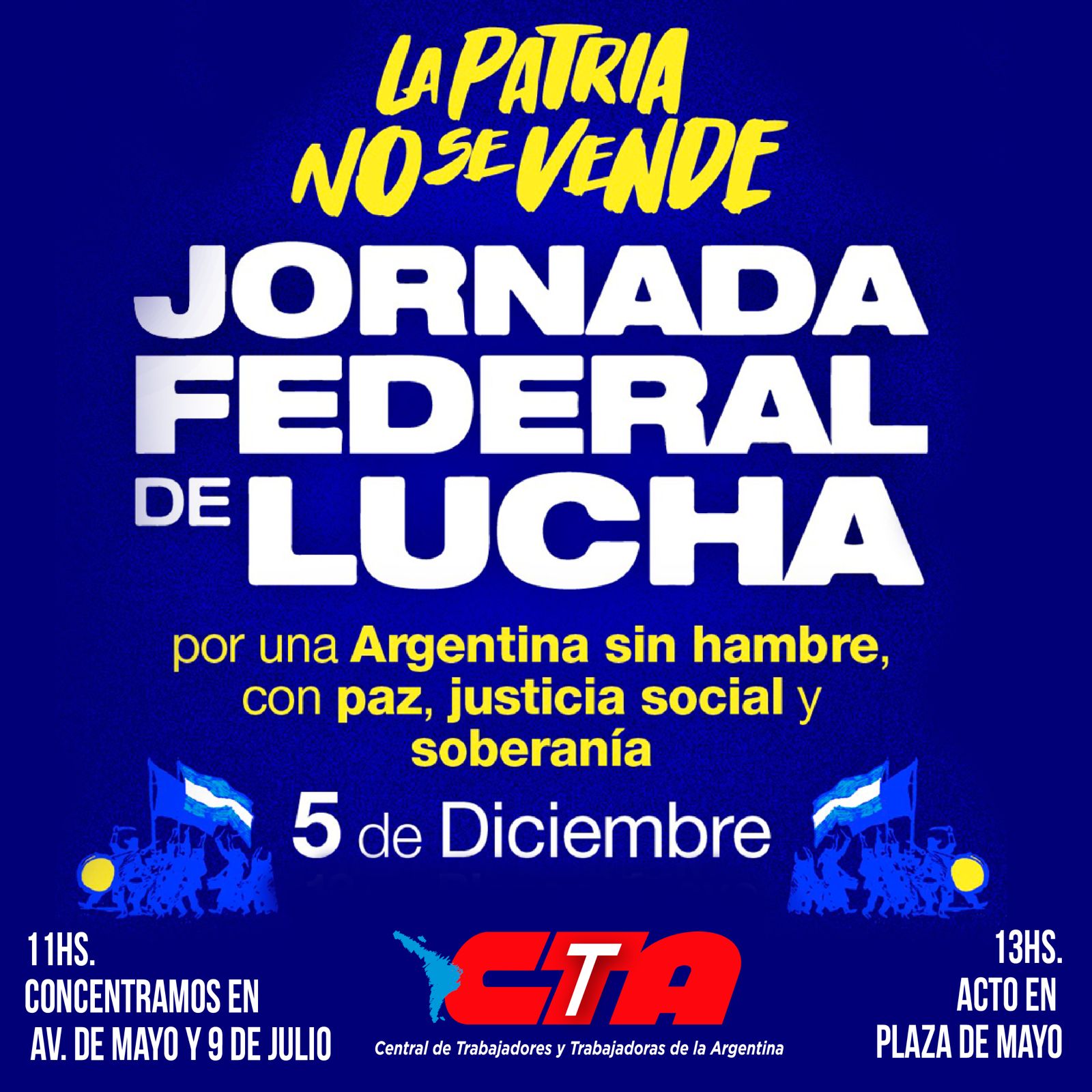 La CTA de las y los Trabajadores y la CTA Autónoma convocan a la Jornada Federal de Lucha que se realizará el próximo jueves 5 de diciembre en todo el país. En el AMBA se movilizará a las 13 hs a Plaza de Mayo. Junto a las dos CTA convocan la UTEP, Sindicatos de la CGT, sectores Pymes, agrupaciones políticas y Organismos de DDHH.