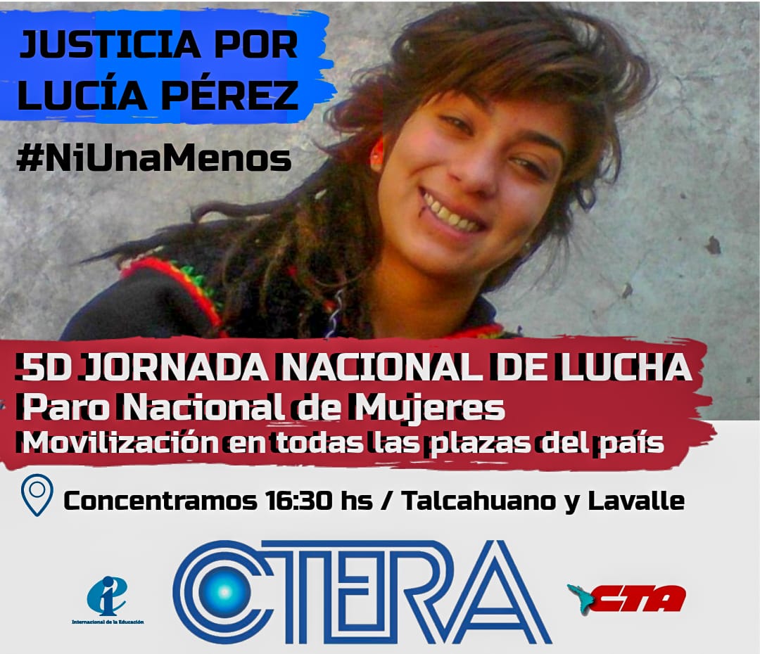 Desde la CTERA llamamos a una jornada de lucha: por Lucía, por todxs, contra la justicia patriarcal. Por el juicio político a los jueces y revocatoria del fallo de impunidad. Vamos a participar del Paro de Mujeres con las modalidades que definan los sindicatos y organizaciones: Paro, asambleaa, ceses de tareas, movilizaciones, campañas de sensibilización.