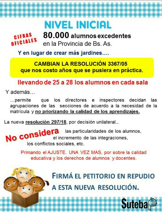 La nueva Resolución 297/18 para Nivel Inicial, dispuesta por el Gobierno unilateralmente, modifica de forma ilegal la Resolución 3367/05, por la que lxs Trabajadorxs de la Educación realizaron una ardua lucha, y eleva de 25 a 28 lxs niñxs en cada sala.
