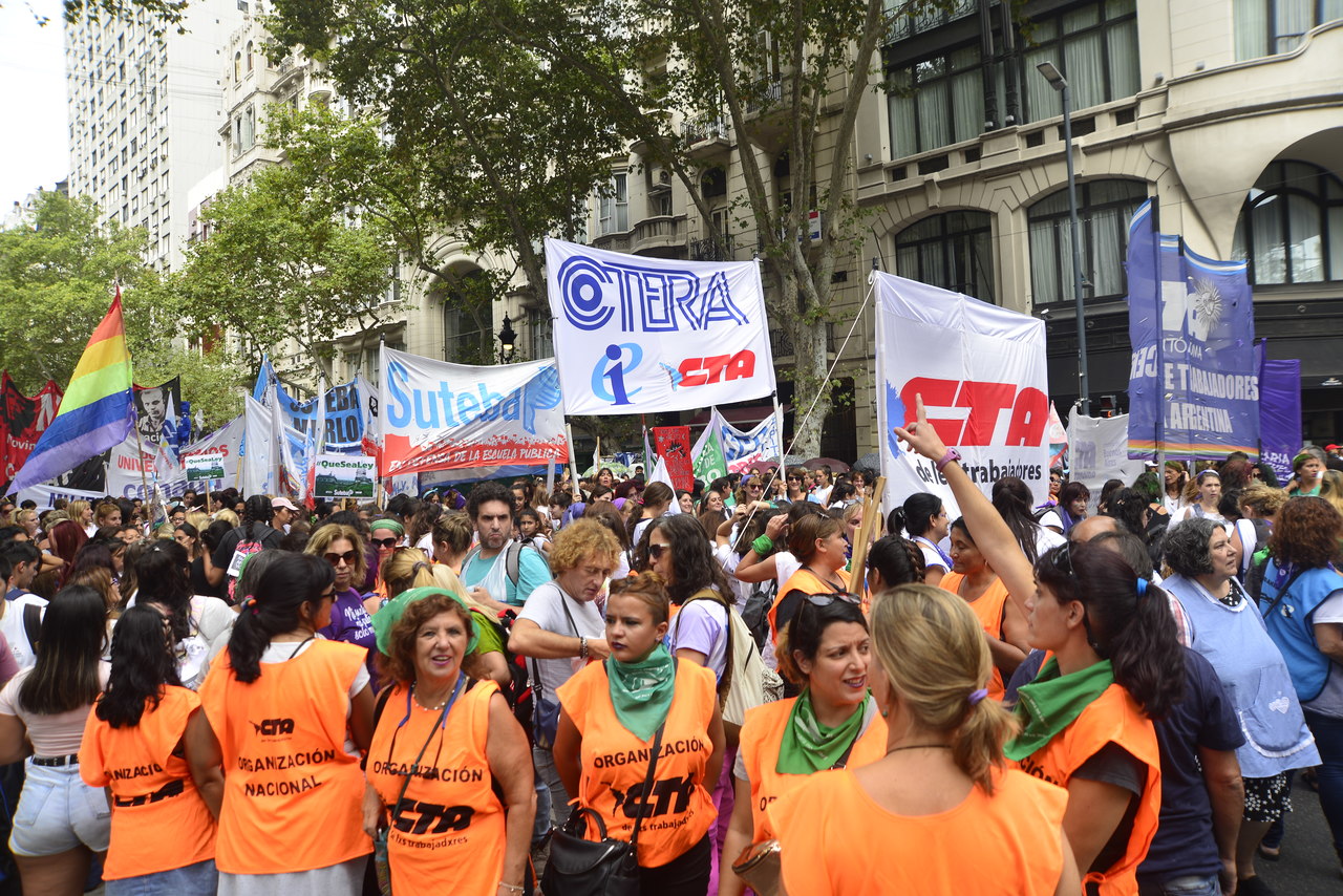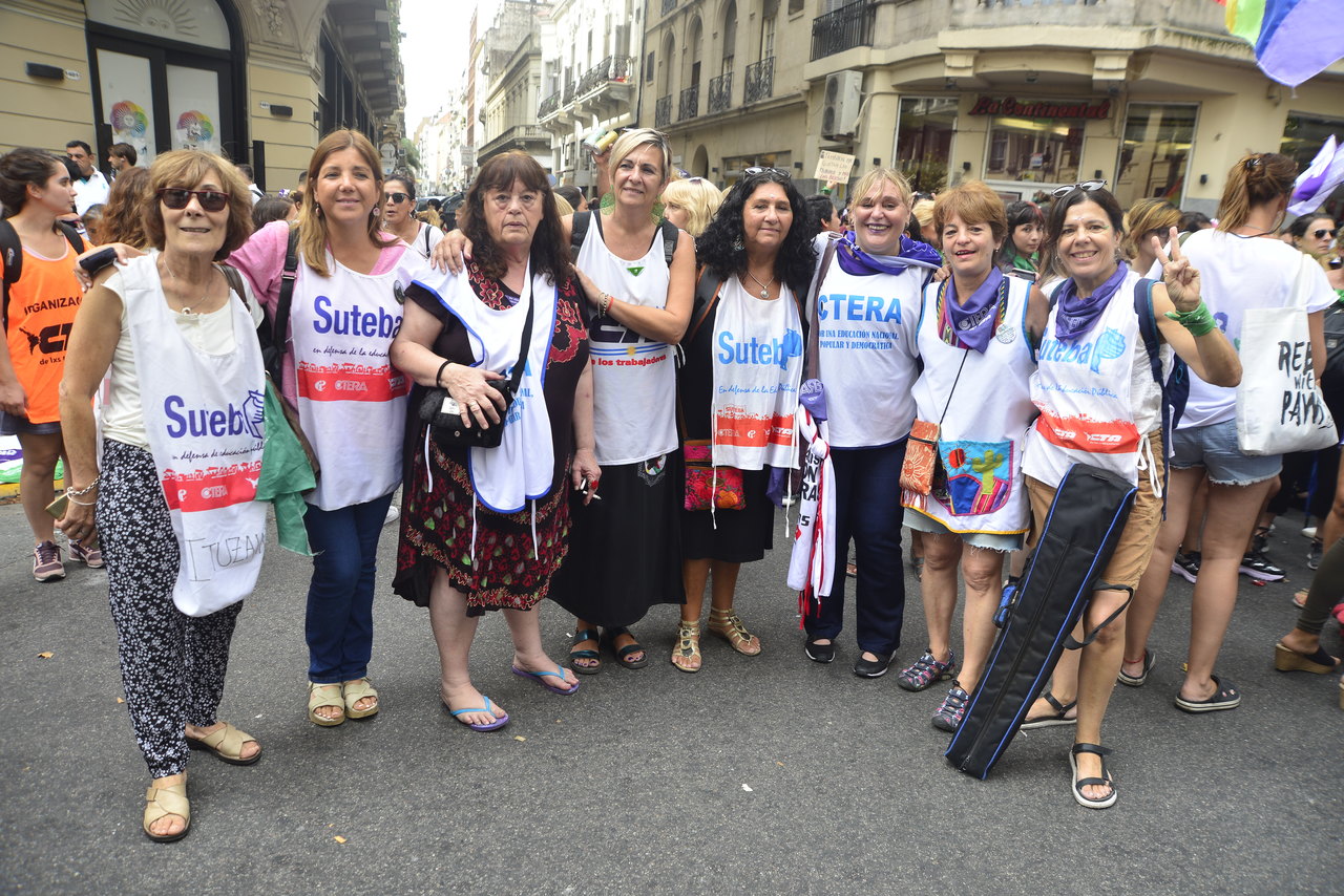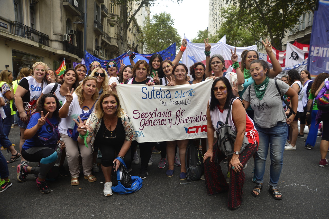 Durante la marcha, la Secretaria de Igualdad de Géneros y Diversidad de SUTEBA, Cristina Echegoyen, compartió: "Nos movilizamos con todas las Centrales de Trabajadorxs de la Argentina para darle continuidad al trabajo que venimos realizando desde los años de resistencia al neoliberalismo. Marchamos por nuestras vidas, porque sigue siendo cotidiana la violencia hacia las mujeres y diarios los femicidios. Reclamamos porque la deuda que adquirió el gobierno macrista y neoliberal nos somete a todxs, principalmente a las mujeres y a las diversidades sexuales con la falta de trabajo. Además, desde SUTEBA celebramos la conformación de un Ministerio de las Mujeres en la Provincia y las declaraciones desde la DGCyE que plantean que la Educación Sexual Integral va a ser una política de Estado y una política educativa fuerte. Es una de las herramientas necesarias para el cambio cultural. Queremos y necesitamos ESI con perspectiva de género y de diversidad, que no se asiente en el binarismo biológico".