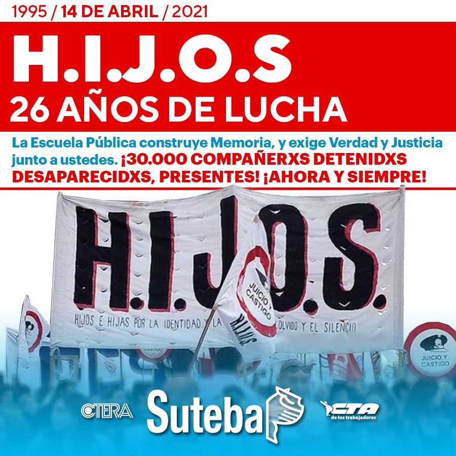 Hoy, 14 de abril, desde el SUTEBA celebramos los 26 años de la fundación Hijos e Hijas por la Identidad y la Justicia contra el Olvido y el Silencio; y homenajeamos su lucha en defensa de los Derechos Humanos y por Memoria, Verdad y Justicia.