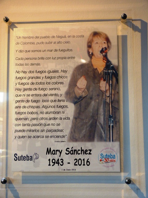 Finalmente se descubrió una placa en la sede sindical que la tiene como protagonista de la creación del SUTEBA junto a Hugo Yasky, Cecilia Martínez y Susana Buccicardi; entre un puñado de "locos" que soñaron con esta apuesta como los salmones a contracorriente.