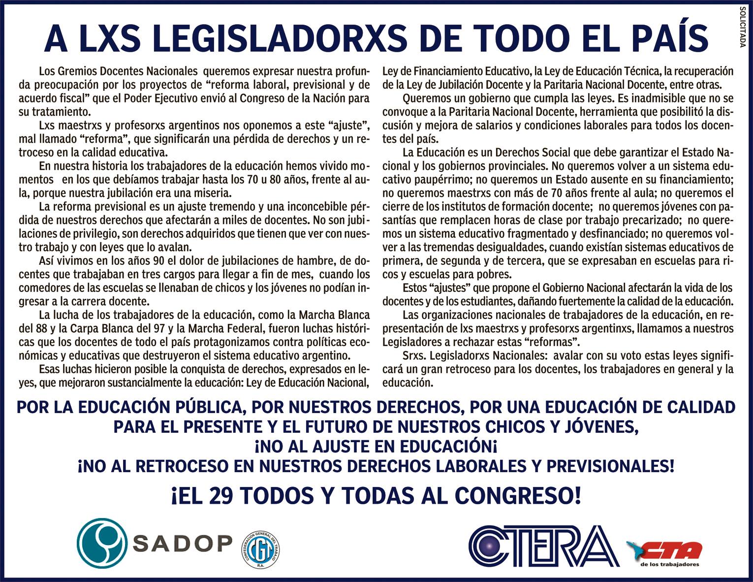 Las organizaciones nacionales de trabajadores de la educación, en representación de lxs maestrxs y profesorxs argentinxs, llamamos a nuestros Legisladores a rechazar estas "reformas".