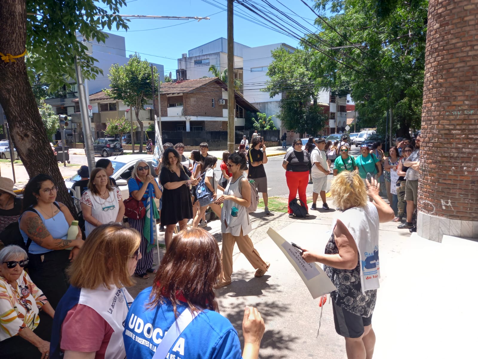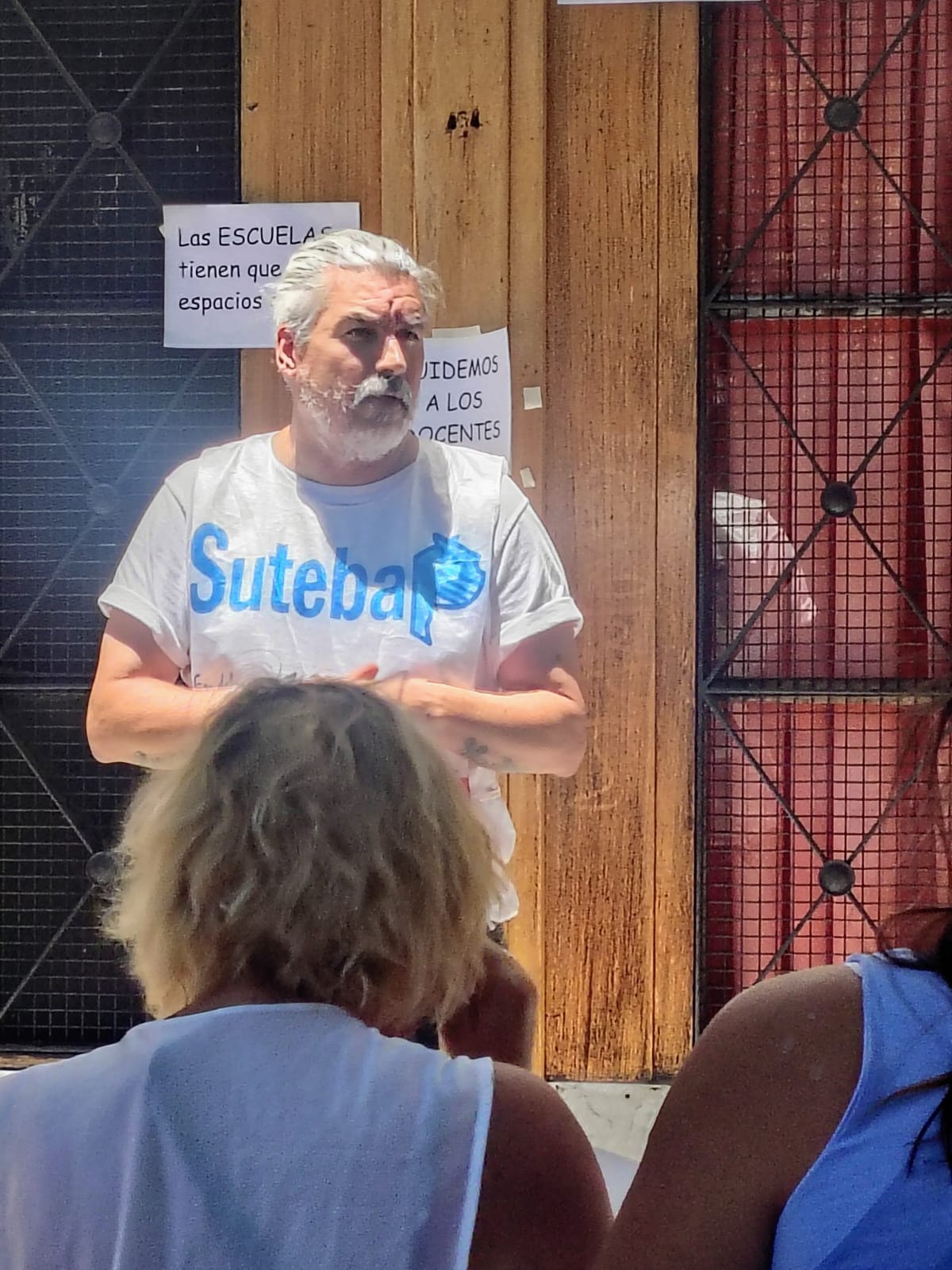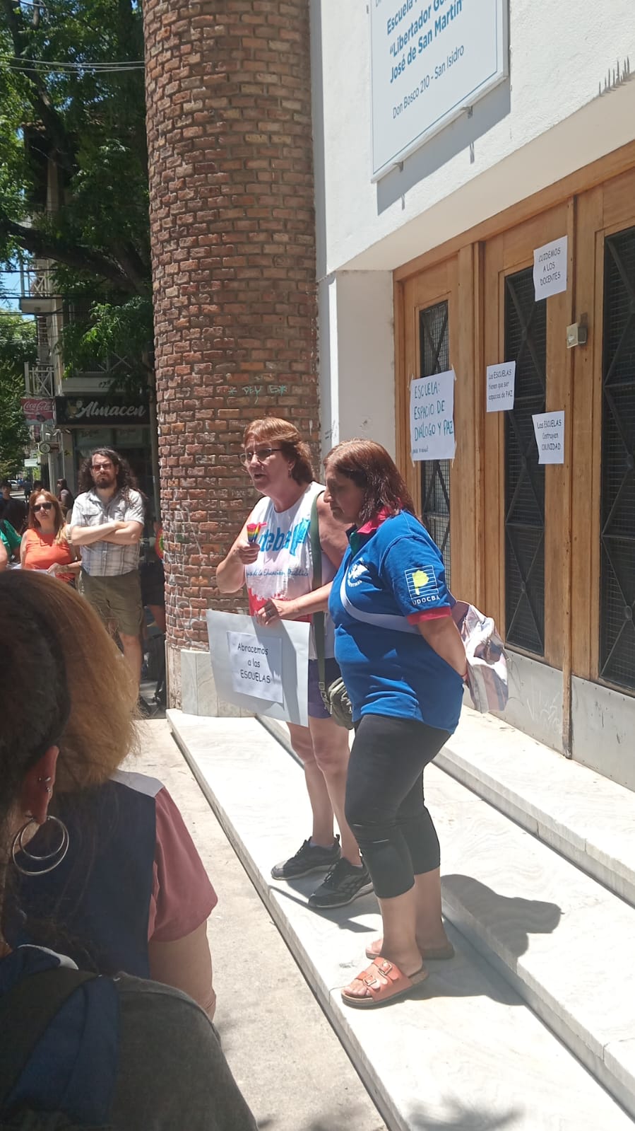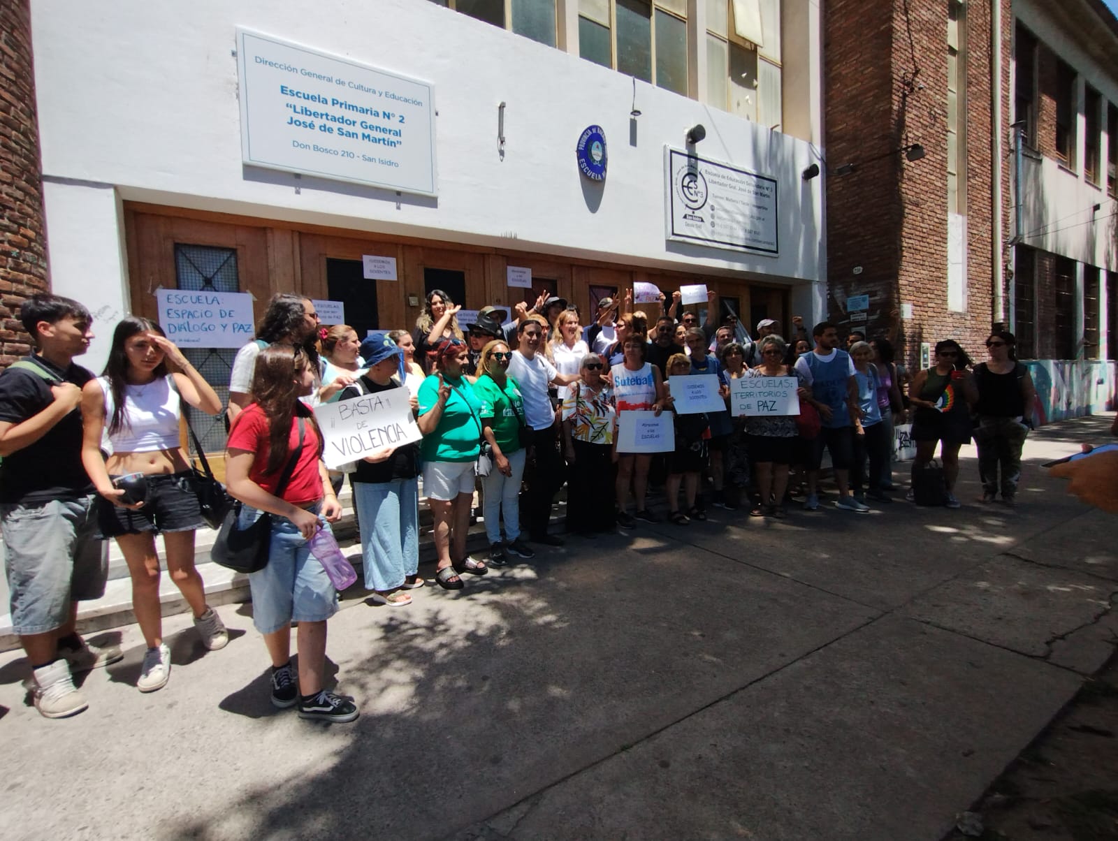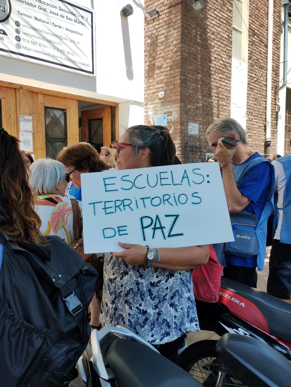 El viernes 12 de diciembre, el SUTEBA San Isidro se reunió en las puertas de la Escuela Secundaria Nº 3 de San Isidro para realizar un abrazo simbólico. La actividad se llevó adelante junto a Docentes, Auxiliares, Centros de Estudiantes, Raquel Witis en representación de la Comisión Memoria, Verdad y Justicia – Zona Norte, Organizaciones Sociales, vecinxs y representantes gremiales de ATE, FEB, SADOP y UDOCBA.