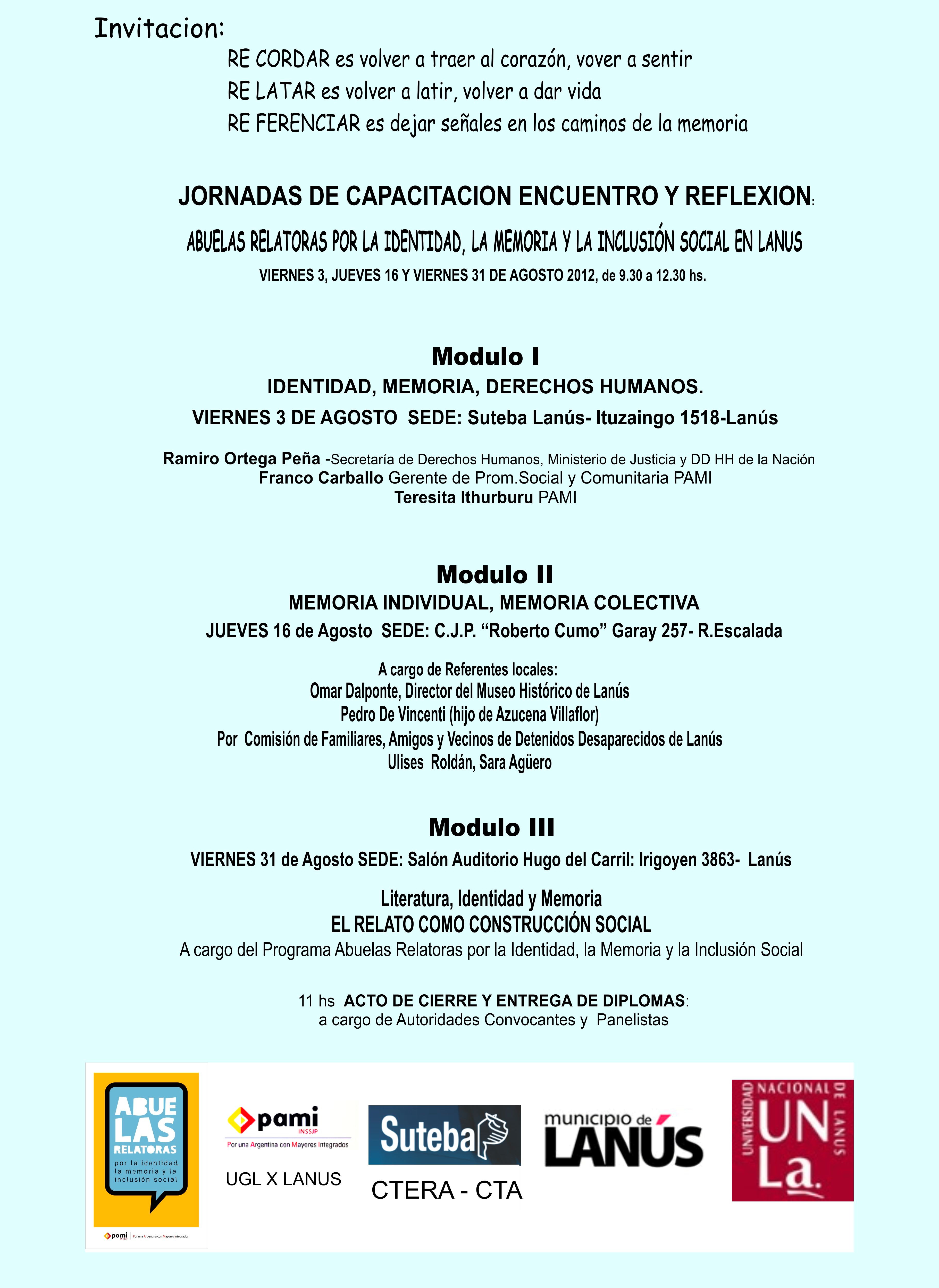 JORNADAS DE CAPACITACIÓN, MEMORIA Y REFLEXIÓN "ABUELAS RELATORAS POR LA IDENTIDAD, LA MEMORIA Y LA INCLUSIÓN SOCIAL EN LANÚS"