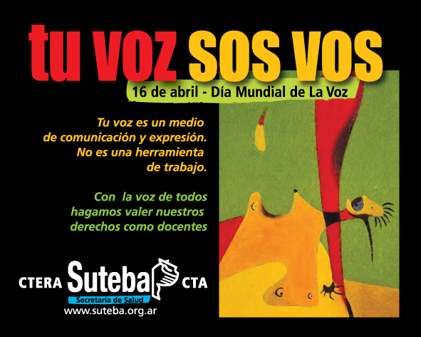 La Campaña de Promoción “Tu voz sos vos”, tiene como objetivo informar y reforzar el concepto de que para los docentes la voz es un instrumento de expresión y comunicación. Es parte de su cuerpo, NO es una herramienta de trabajo.