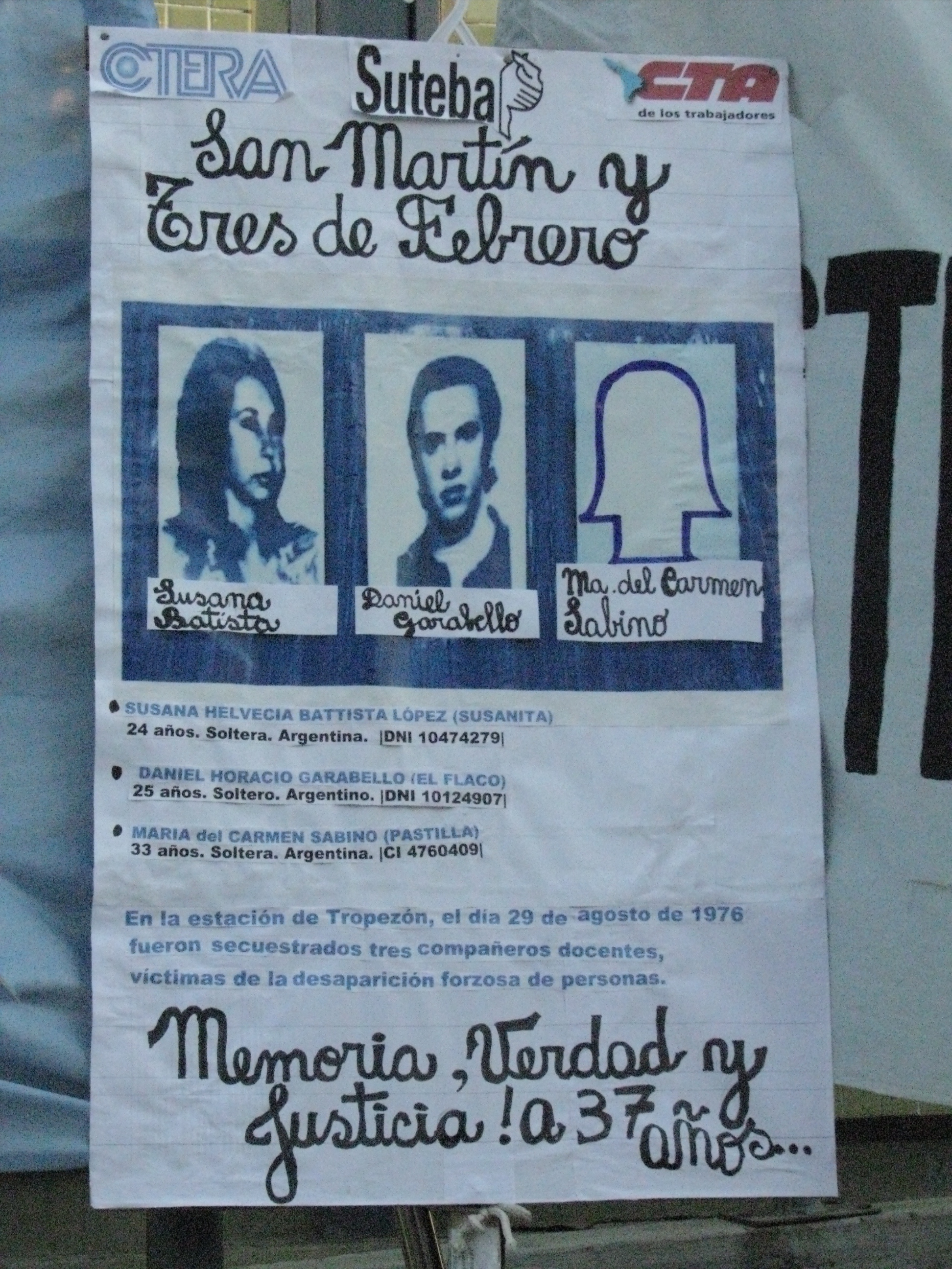 El jueves 29 de agosto, se realizó un homenaje en la estación Tropezón, partido de San Martín, para recordar la desaparición de los compañeros docentes Daniel Horacio "el Flaco" Garabello, María del Carmen "Pastilla" Sabino, y Susana Helvecia Battista, secuestrados en la estación el 29 de agosto de 1976 por un grupo de tareas de la Escuela de Mecánica de la Armada (ESMA).