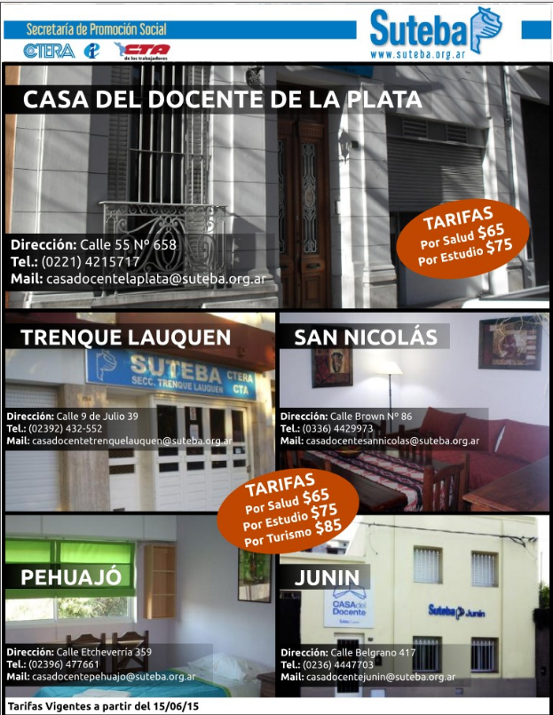 Con la nueva modalidad si, por ejemplo, estás de viaje por Rosario o si vas a visitar a la Virgen de San Nicolás, podés acercarte a la Casa del Docente que SUTEBA tiene en San Nicolás y utilizar la casa para alojamiento. Lo mismo si estás viajando a Trenque Lauquen, Pehuajó o Junín, tenés la posibilidad de alojarte momentáneamente en cada unidad si estás de paso por estas ciudades. Esto no es válido para la casa de La Plata.