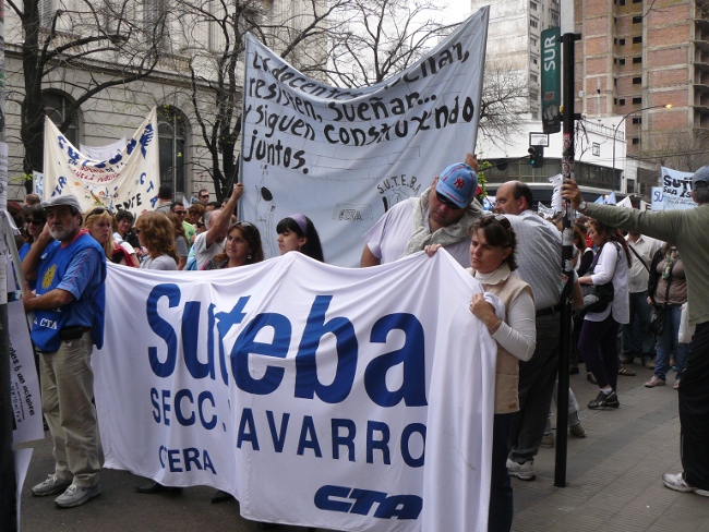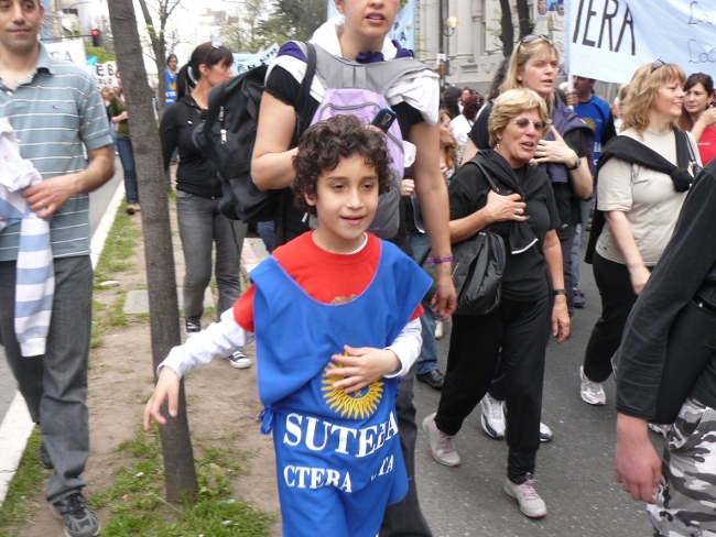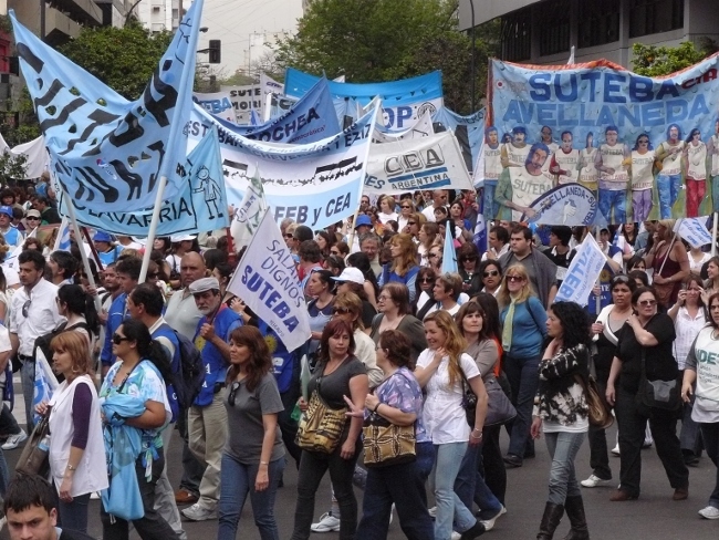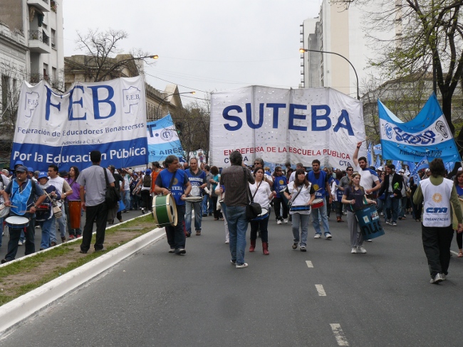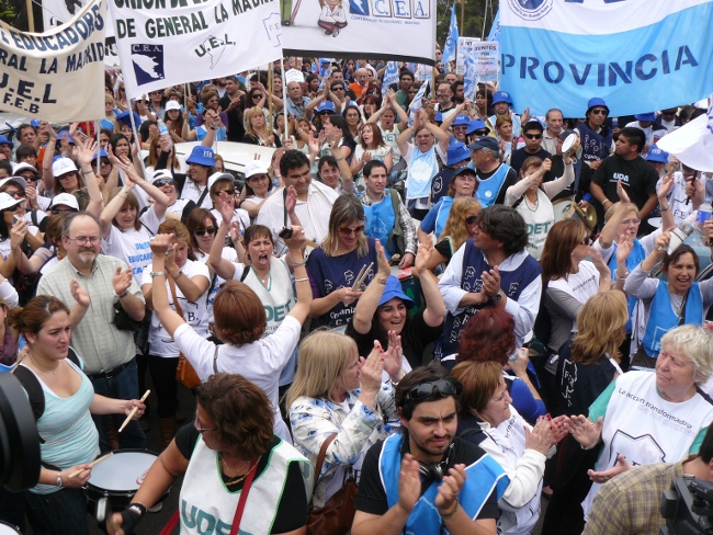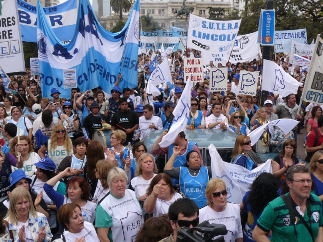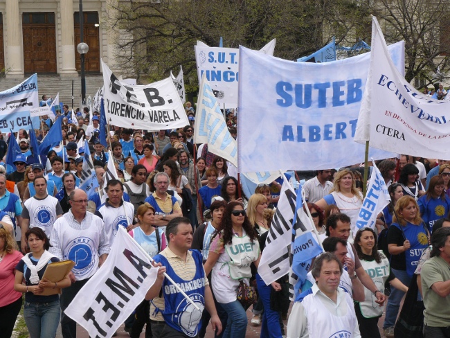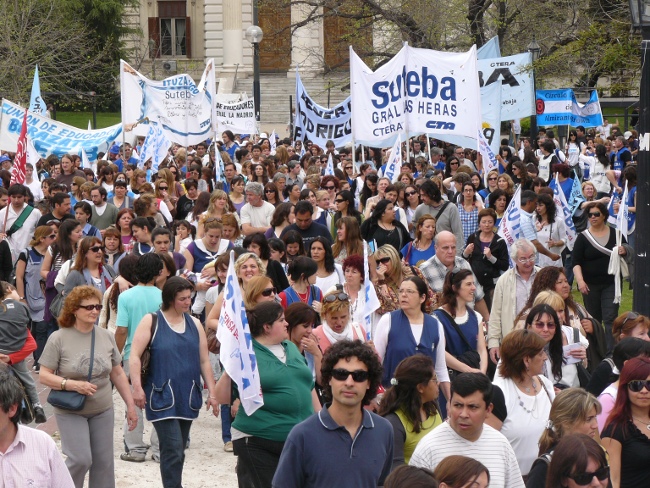 “Estamos acá para plantear muy claramente al gobernador Daniel Scioli: queremos que se abran las paritarias en la provincia de Buenos Aires. Hace poco más de dos meses, la Nación le condonó la deuda a la provincia de Buenos Aires. Entonces, el Gobierno de la provincia de Buenos Aires está en condiciones de hacerse cargo de los reclamos de los trabajadores. Y si no hay voluntad política de la Provincia, hay voluntad política de los trabajadores. Por eso compañeros, no se puede desconocer la pérdida del poder adquisitivo de nuestro salario. Queremos discutir aumento salarial, pero también que les paguen el salario familiar a todos los docentes que están siendo discriminados. El salario familiar es un derecho universal. También las ganancias se las tienen que cobrar a aquellos que tienen plata, no al salario de los trabajadores. Todo esto lo queremos discutir en paritarias. Lo mismo ocurre con los cargos docentes: Está bien que se hayan nombrado cargos para Educación Especial, y la creación de cargos para Educación Artística y Educación Física. Pero también queremos la creación de cargos para bibliotecarios, equipos de orientación escolar, preceptores y personal jerárquico en todas las escuelas de la provincia de Buenos Aires.