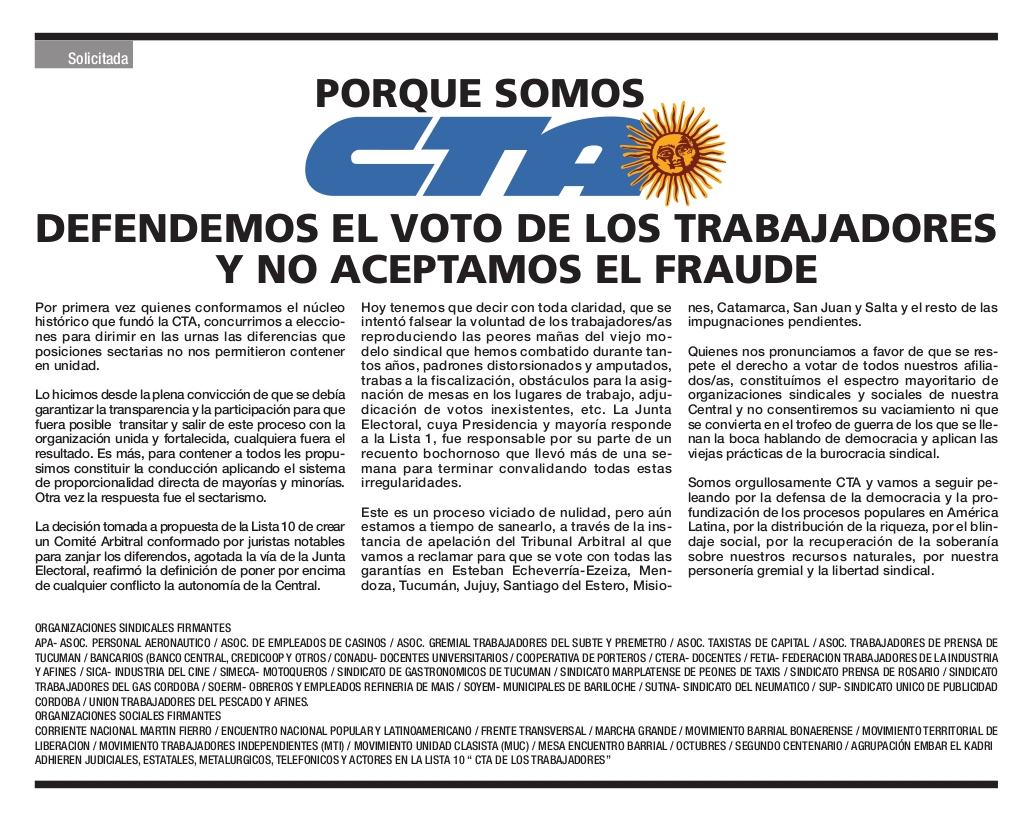 SOLICITADA: PORQUE SOMOS CTA DEFENDEMOS EL VOTO DE LOS TRABAJADORES Y NO ACEPTAMOS EL FRAUDE