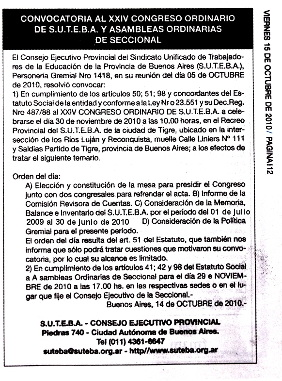El Consejo Ejecutivo Provincial del Sindicato Unificado de Trabajadores de la Educación de la Provincia de Buenos Aires ( S.U.T.E.B.A. ), Personería Gremial Nro 1418, en su reunión del día 05 de OCTUBRE de 2010, resolvió convocar: