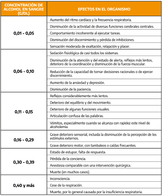 Ver los efectos en el organismo que están relacionados con los niveles de alcohol dosados en sangre o alcoholemia en la imagen del cuadro que se adjunta.