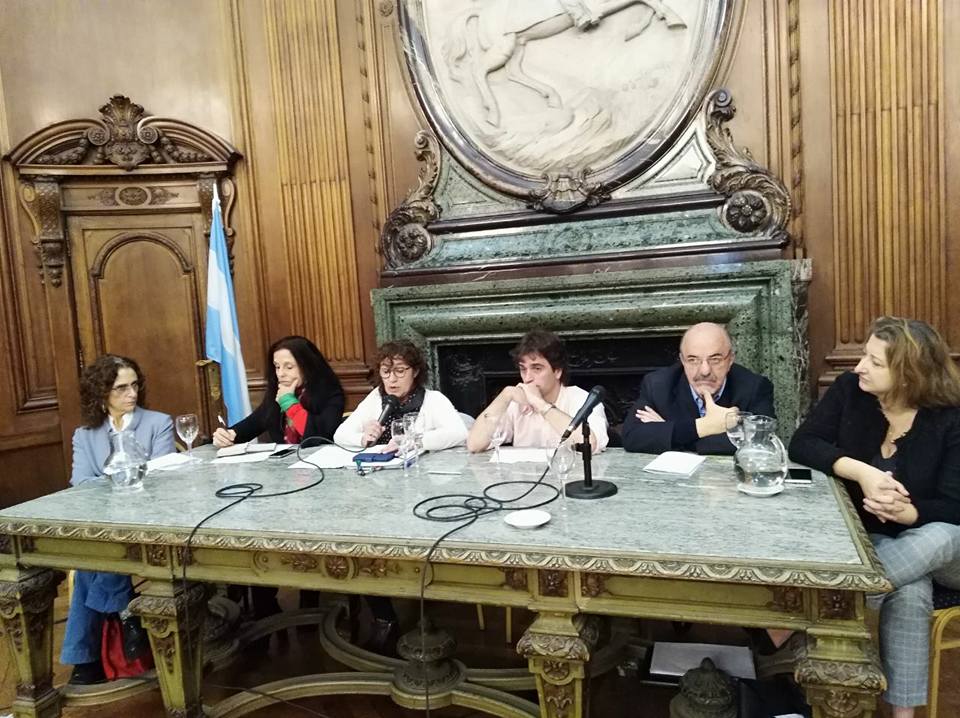 Integraron el panel: Roxana Perazza, pedagoga, Graciela Morgade de la UBA, Carlos Tomada, Gabriel Solano y María Rosa Muiños, Legisladorxs.