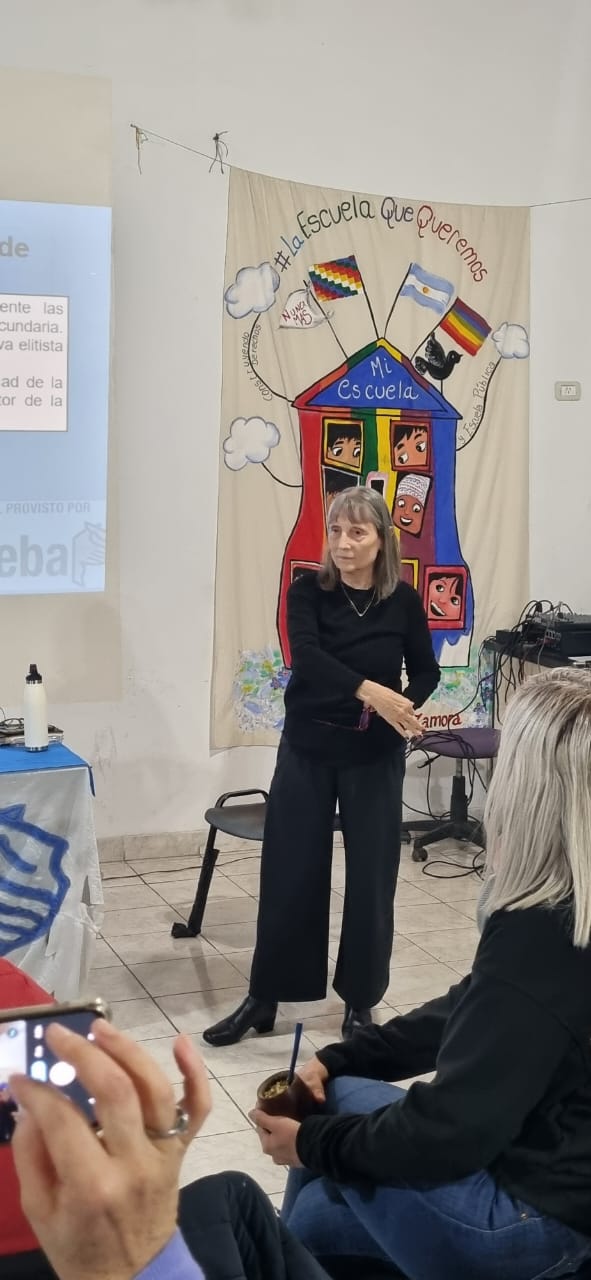 Florencia Riccheri, Subsecretaria Provincial de Planeamiento, Investigación y Estadística Educativa, conversó con lxs compañerxs sobre los desafíos de pasar de una Secundaria de matriz elitista a una construida sobre una gramática del derecho y la responsabilidad; para concluir luego con un taller de escritura conducido por Mabel Albondanza, integrante de la Secretaría.