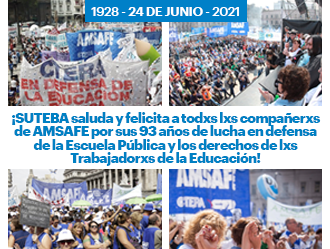 ¡SUTEBA saluda y felicita a lxs compañerxs de AMSAFE por sus 93 años de lucha en defensa de la Escuela Pública y los derechos de lxs Trabajadorxs de la Educación!