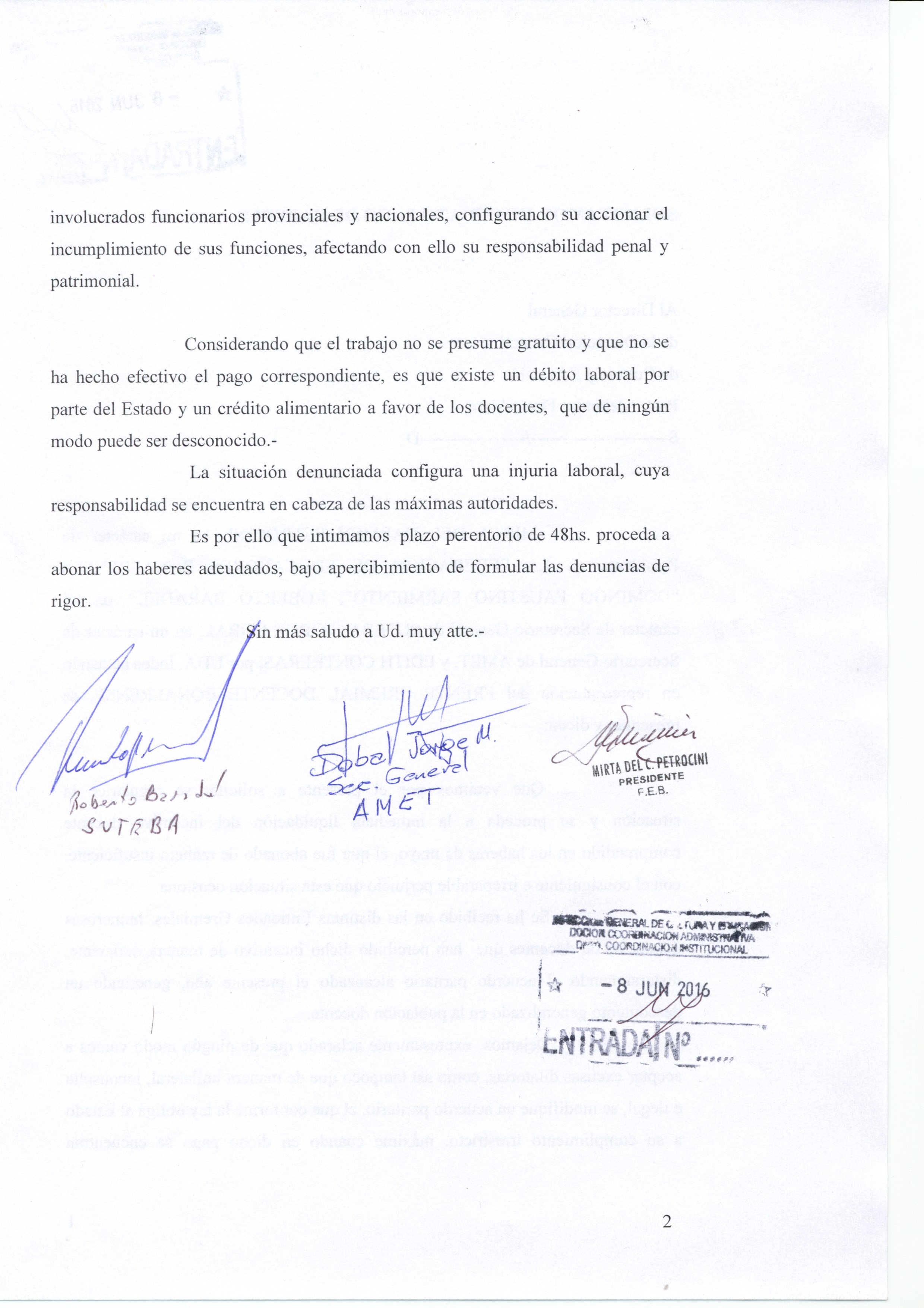 Por último, se intimó un plazo perentorio de 48hs., para que se proceda a abonar los haberes adeudados, bajo apercibimiento de formular las denuncias de rigor.