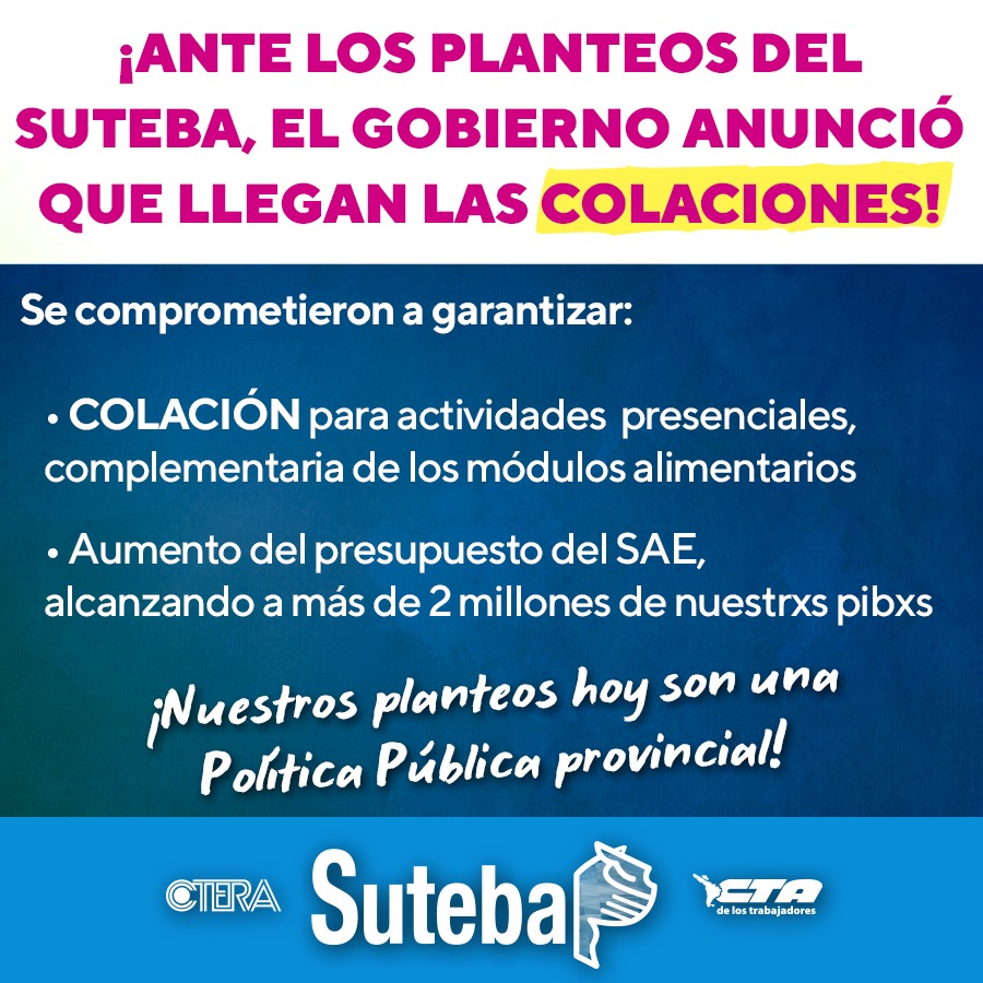 Frente a nuestras solicitudes, Bruno Bozzano, Director de Seguridad Alimentaria, expresó que fueron tenidos en cuenta nuestros planteos e informó que el Gobierno Provincial resolvió garantizar la prestación de una colación a partir de julio.