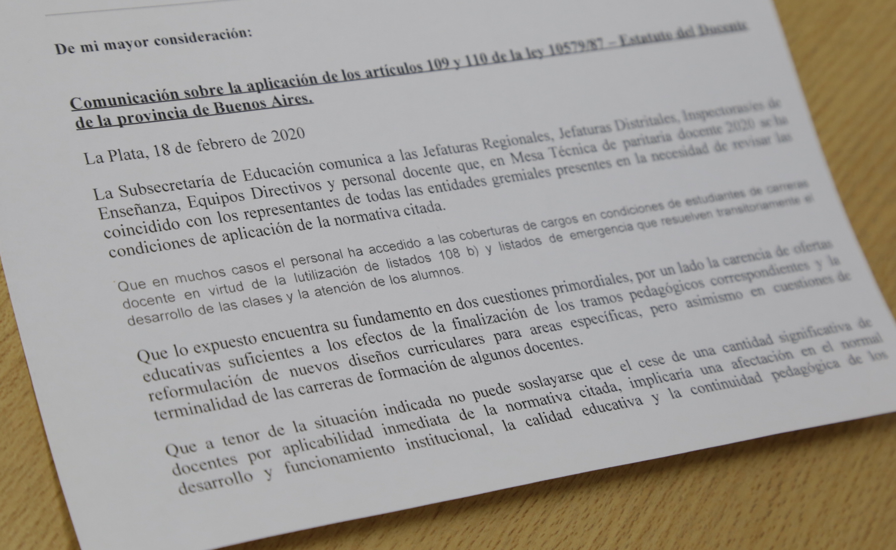 El planteo de nuestro Sindicato se fundamentó en que hay Docentes que accedieron por Listado 108 b o Listados de emergencia en condiciones de Estudiantes de carreras docentes que requieren de planes de terminalidad; que hay una carencia de ofertas educativas en muchos distritos, como así también de los tramos pedagógicos necesarios; que se requiere la reformulación de nuevos diseños curriculares para áreas específicas; y que el cese de Docentes por la aplicación de esta normativa afectaría el normal desarrollo y funcionamiento de muchas Escuelas y la continuidad pedagógica de lxs Alumnxs.