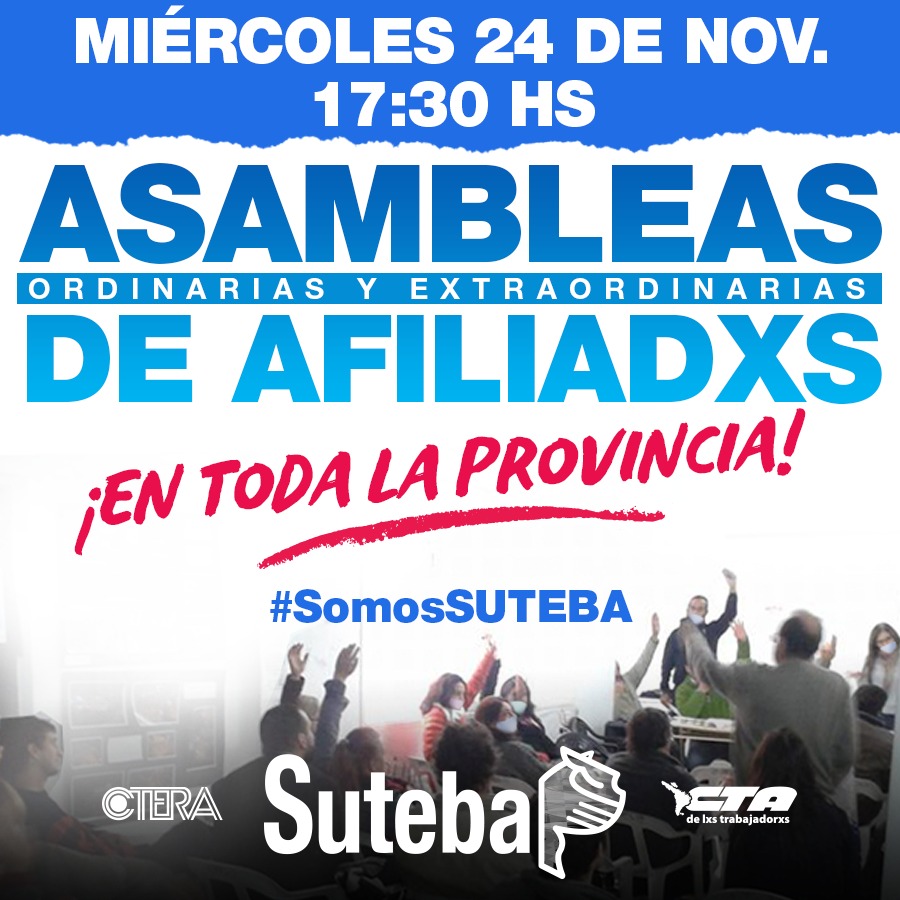 El SUTEBA convoca a Asambleas Ordinarias y Extraordinarias de Seccional en toda la Provincia para el miércoles 24 de noviembre a las 17:30 hs.
