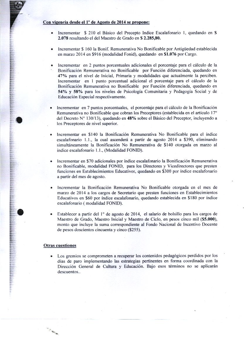 EL RECHAZO DE LA PROPUESTA SE BASÓ en que el mayor aumento (30,9%) era sólo para un 20% de los docentes, aquellos que tenían índice 1.1 (MG, MI, etc). La pelea fue por la extensión de ese porcentaje al 80% restante de los docentes y llegar a un sueldo inicial de 5000 pesos para el MG.