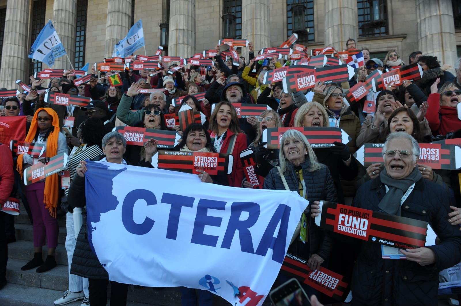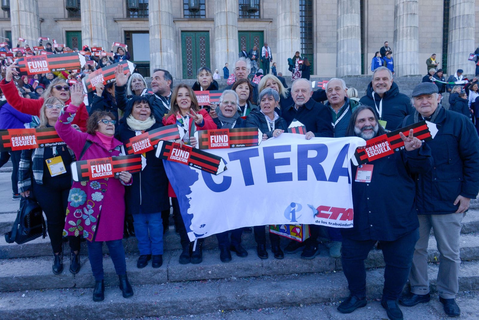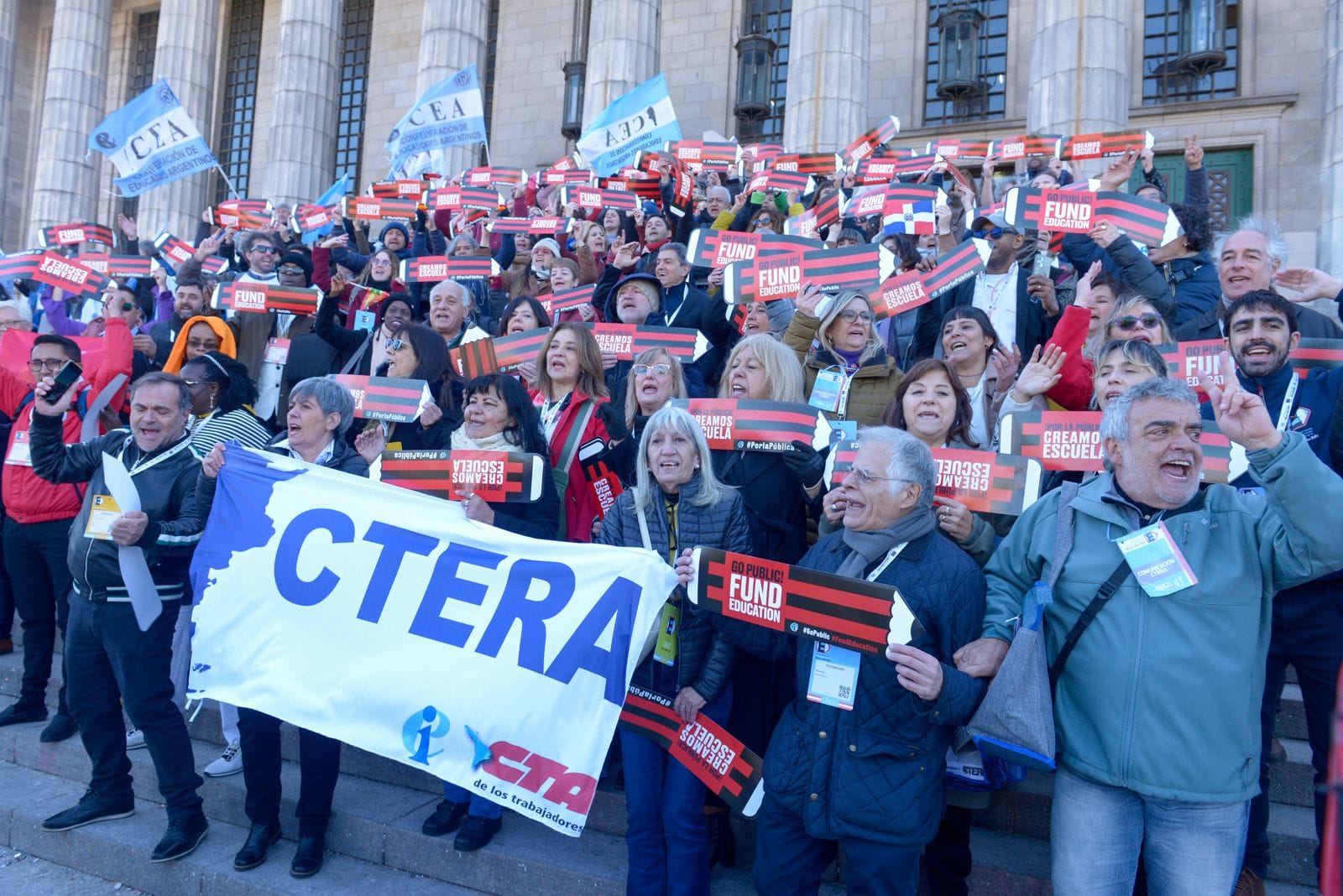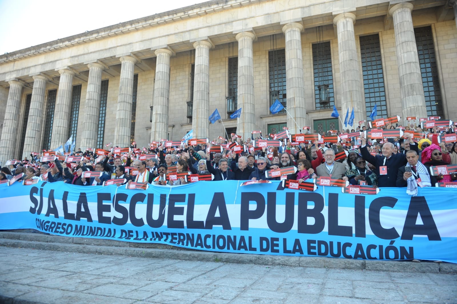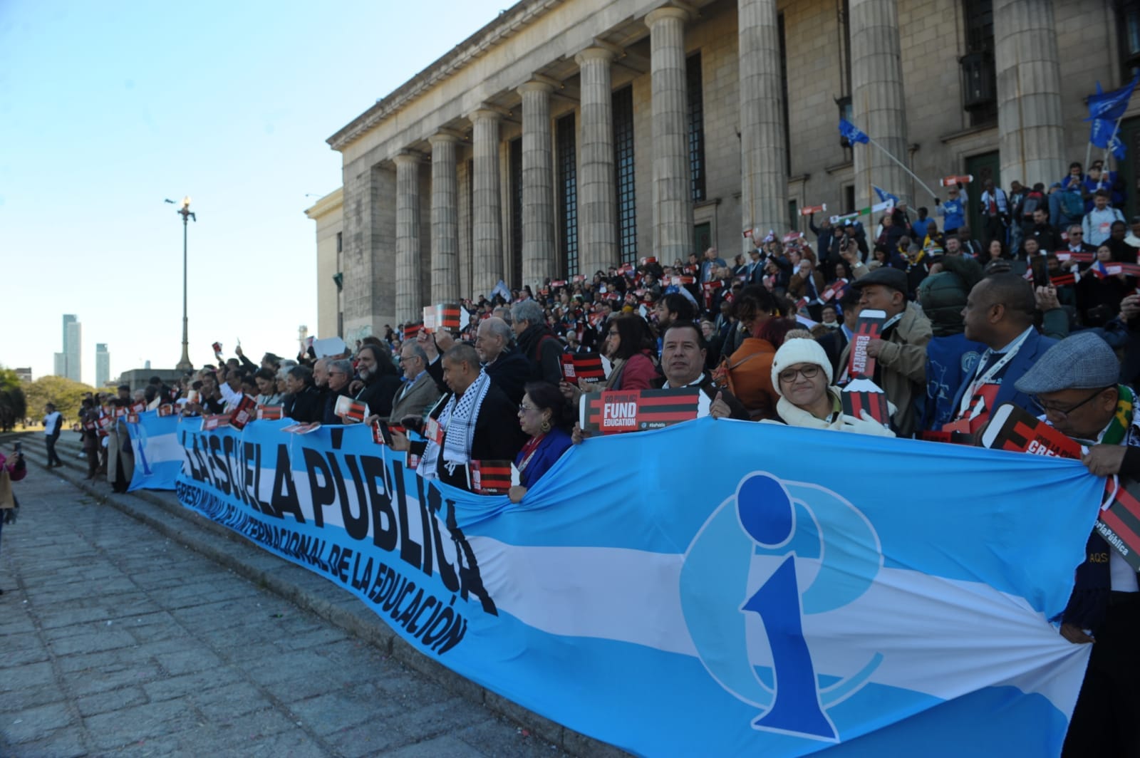 En el día de hoy, lunes 29 de julio, más de 1500 docentes del mundo que forman parte del 10° Congreso Mundial de la IE, participaron de un banderazo en defensa de la educación pública, en las escalinatas de la Facultad de Derecho.