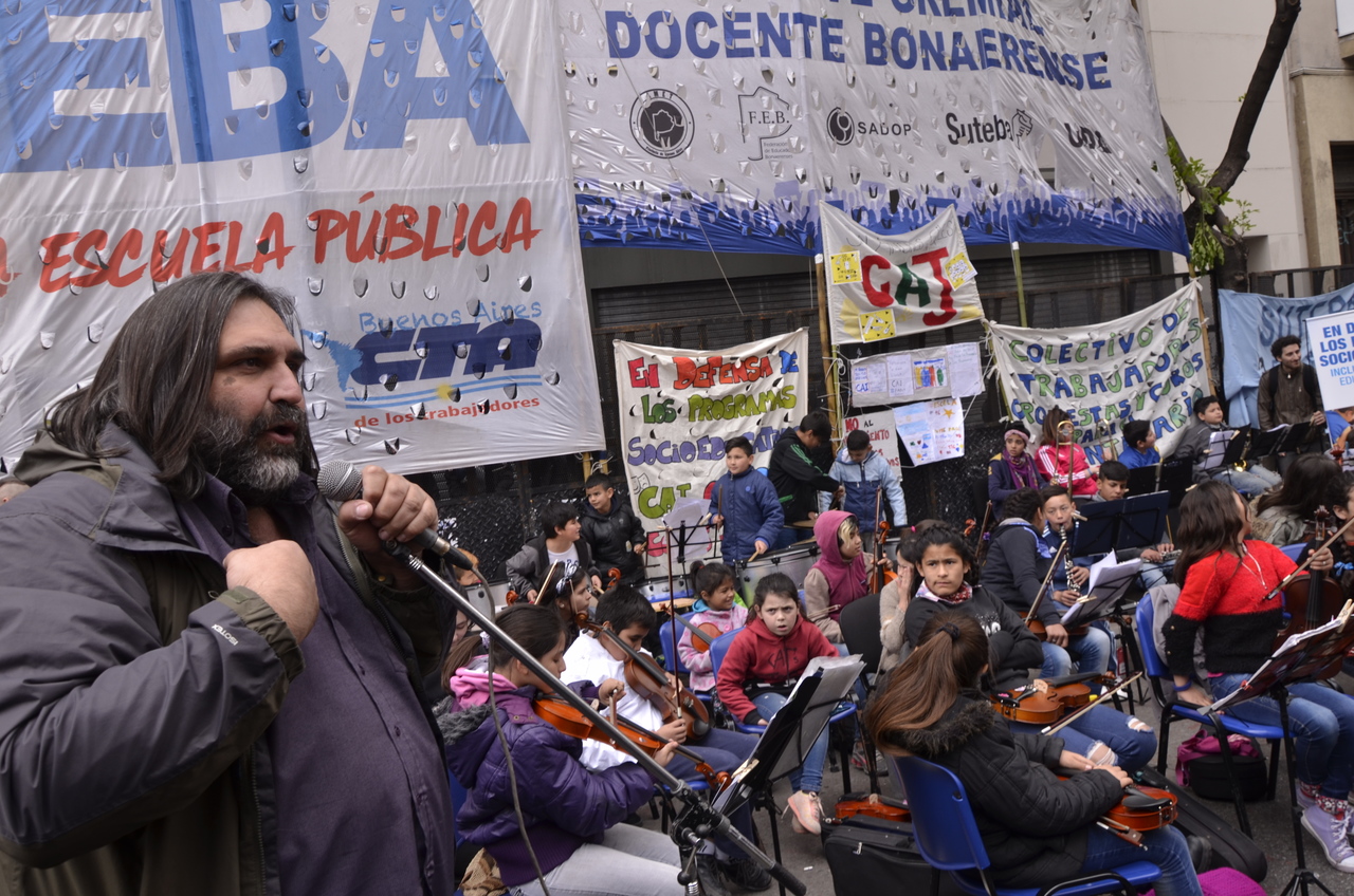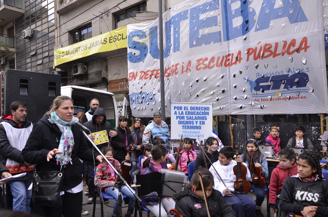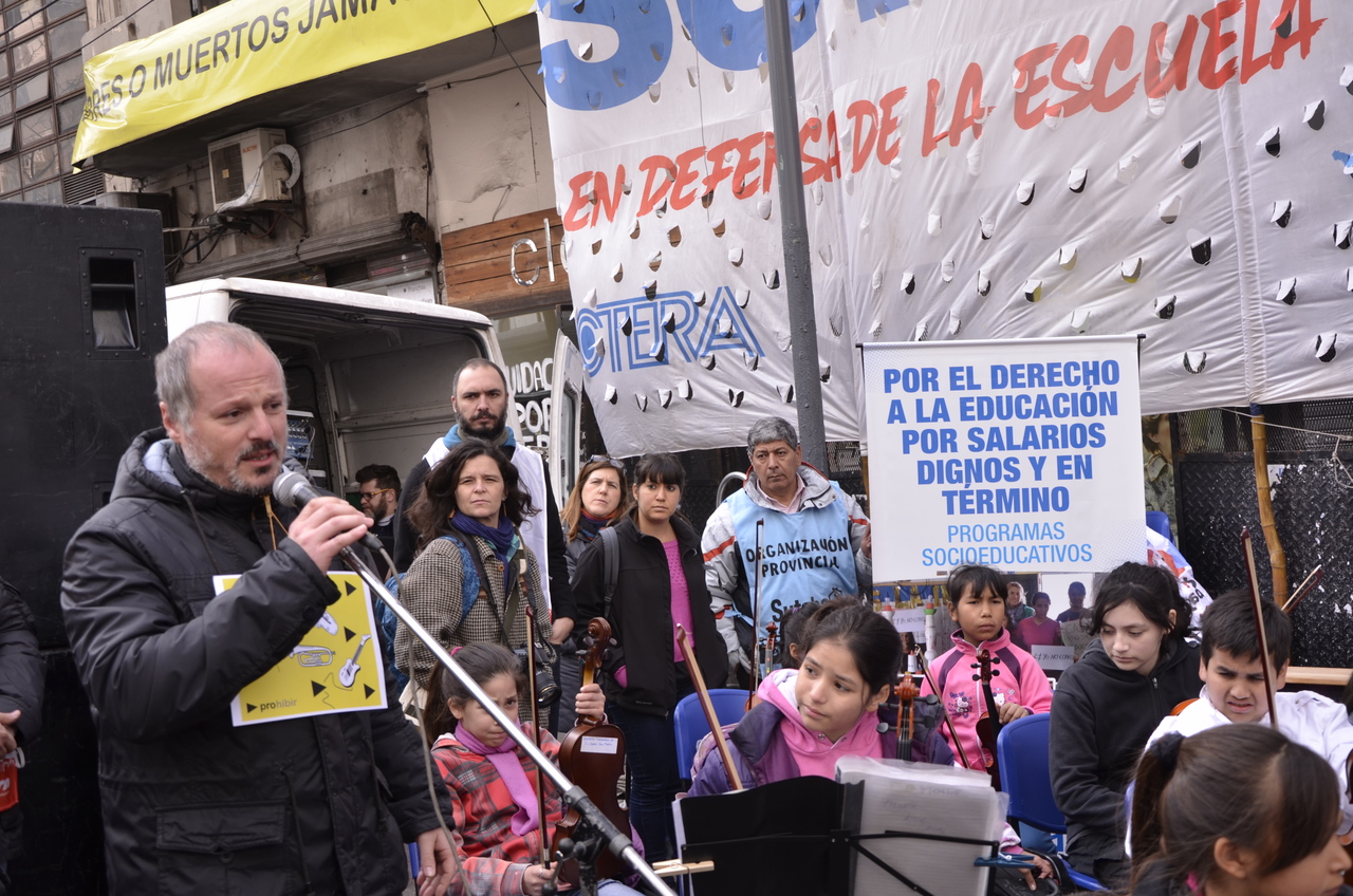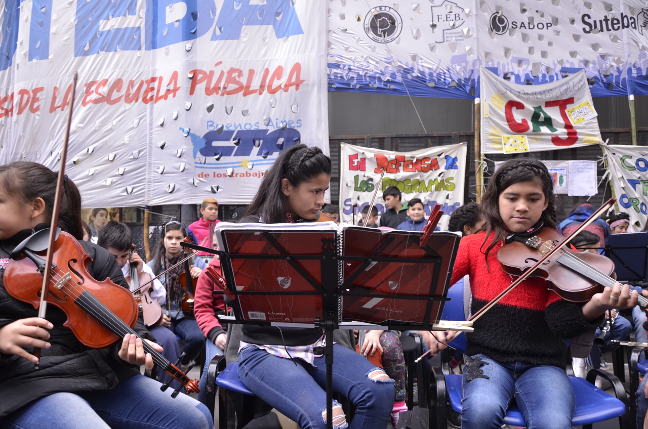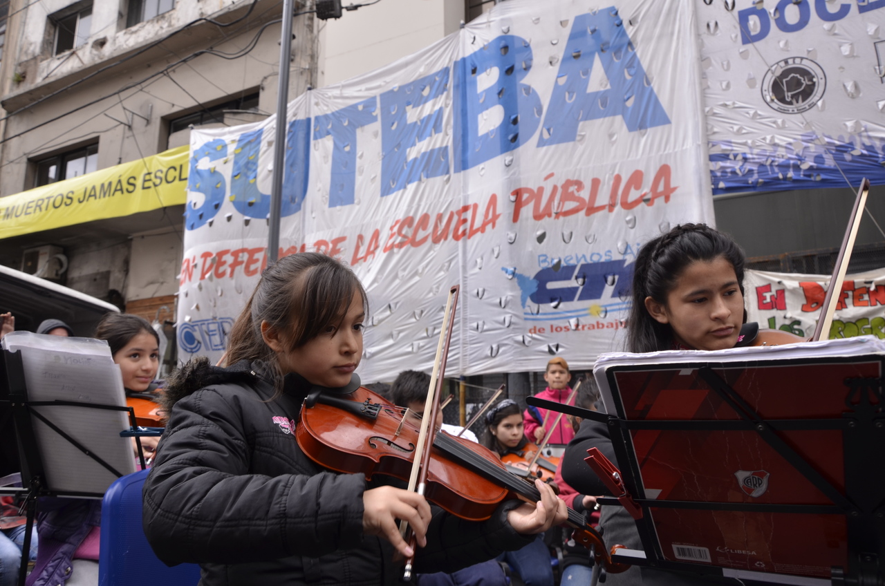 Asimismo, el Secretario General del SUTEBA, Roberto Baradel, tomó la palabra: "Nos movilizamos por la insensibilidad que demuestran el Gobierno Provincial y Nacional, quienes están desmantelando los Programas Socioeducativos. Los chicos pueden dar mucho, hay que agradecerles por los acordes muy bonitos que tocan. Sus papás y nosotros estamos orgullosos de ustedes, como también de sus profesores que construyen Escuela Pública día a día".
