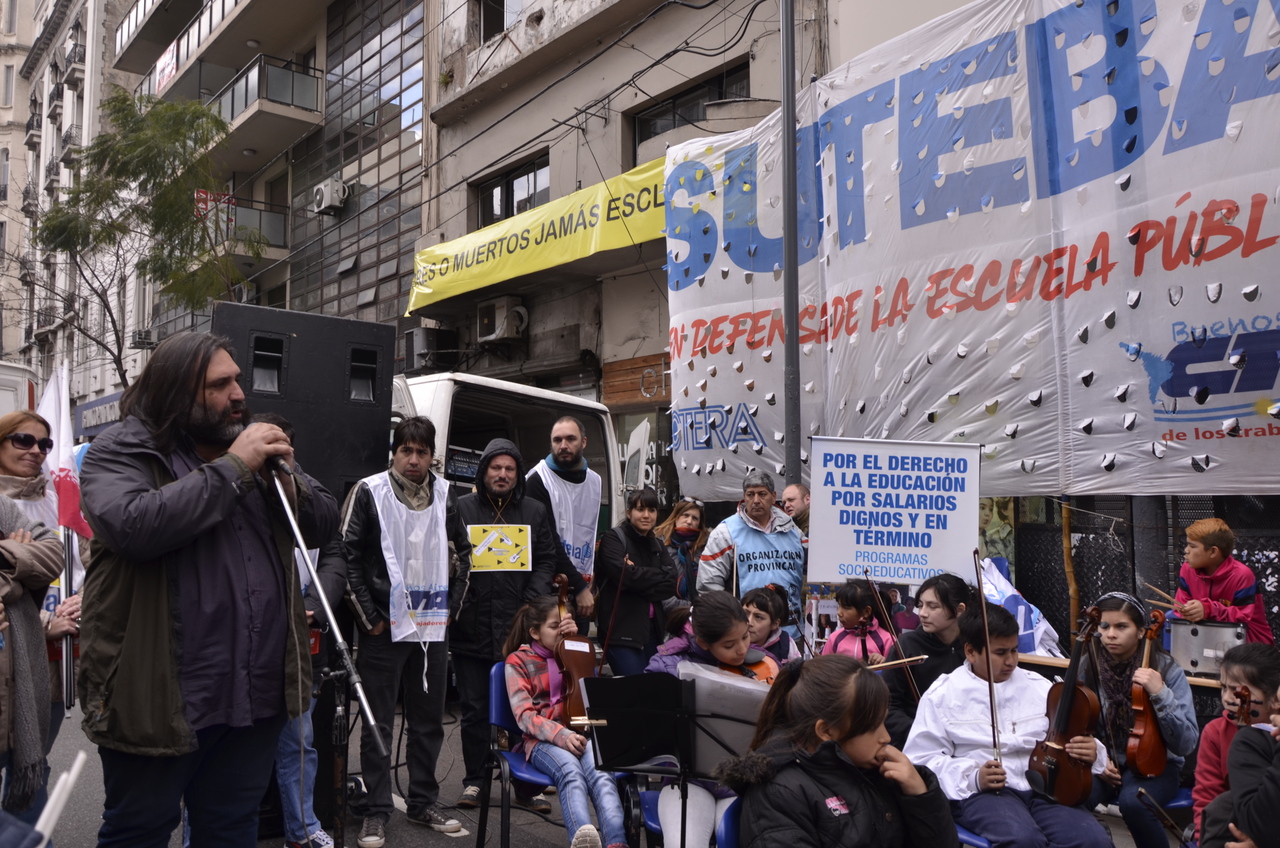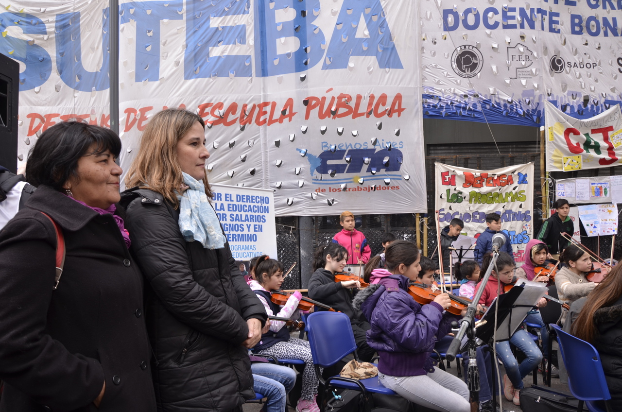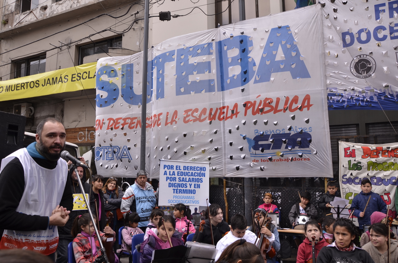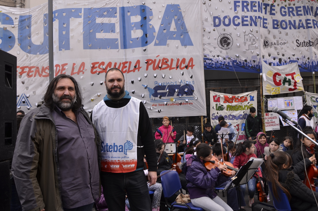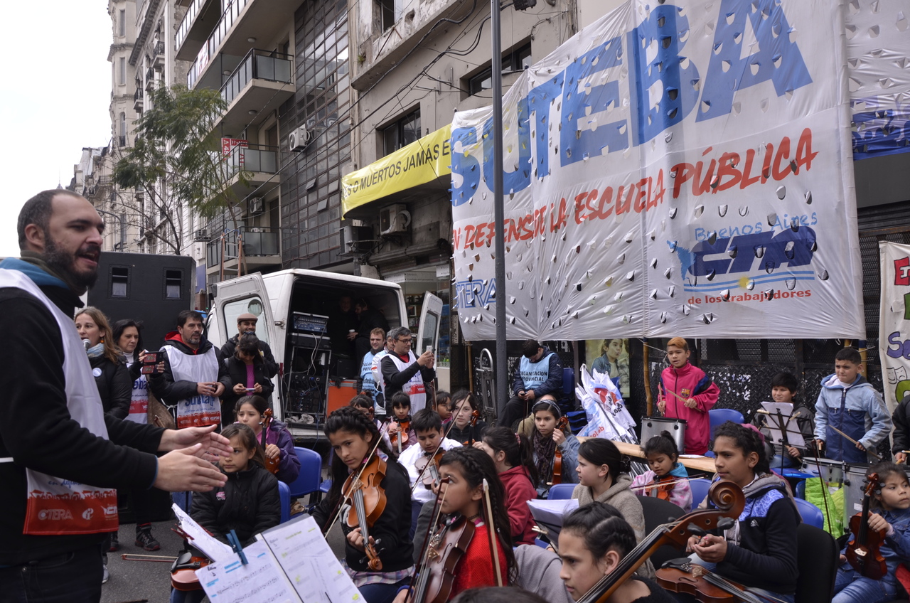 Asimismo, el Secretario General del SUTEBA, Roberto Baradel, tomó la palabra: "Nos movilizamos por la insensibilidad que demuestran el Gobierno Provincial y Nacional, quienes están desmantelando los Programas Socioeducativos. Los chicos pueden dar mucho, hay que agradecerles por los acordes muy bonitos que tocan. Sus papás y nosotros estamos orgullosos de ustedes, como también de sus profesores que construyen Escuela Pública día a día".