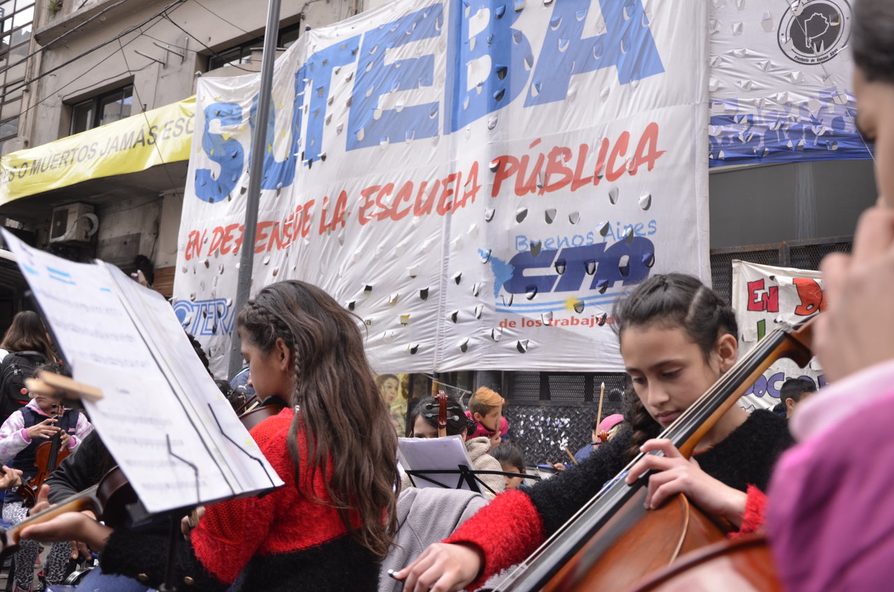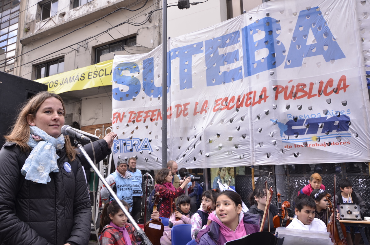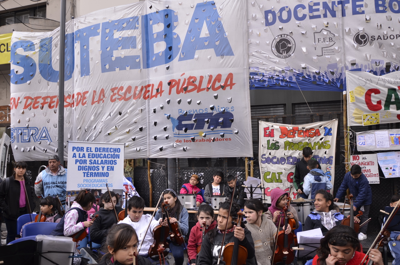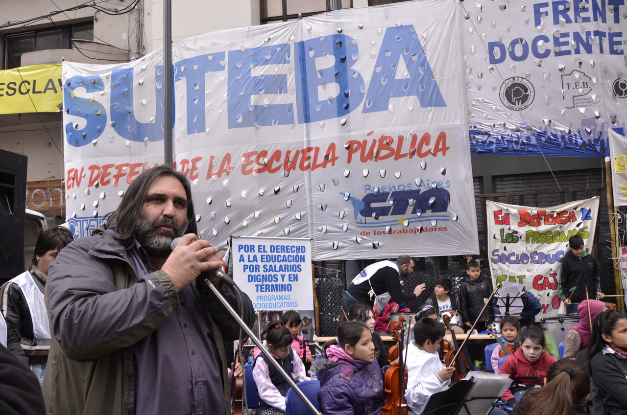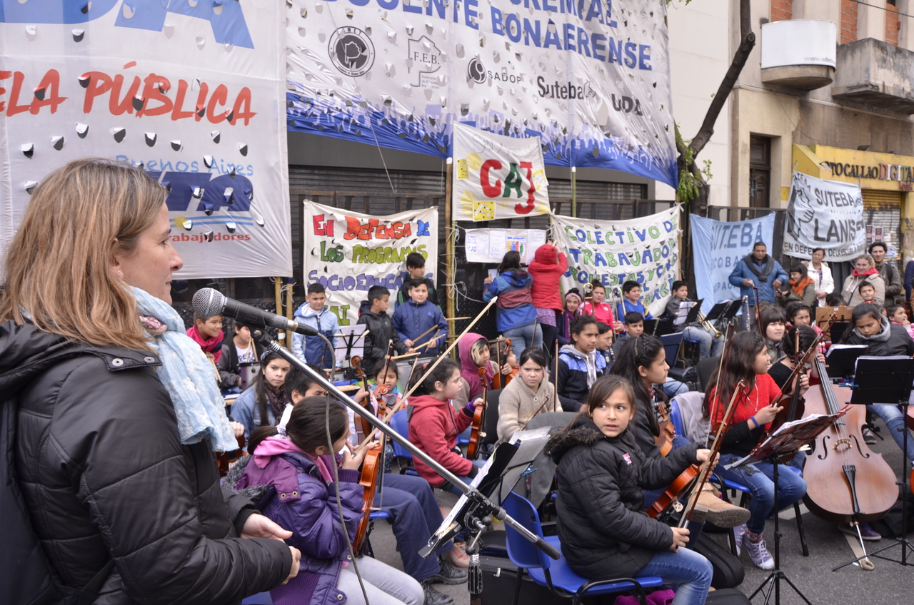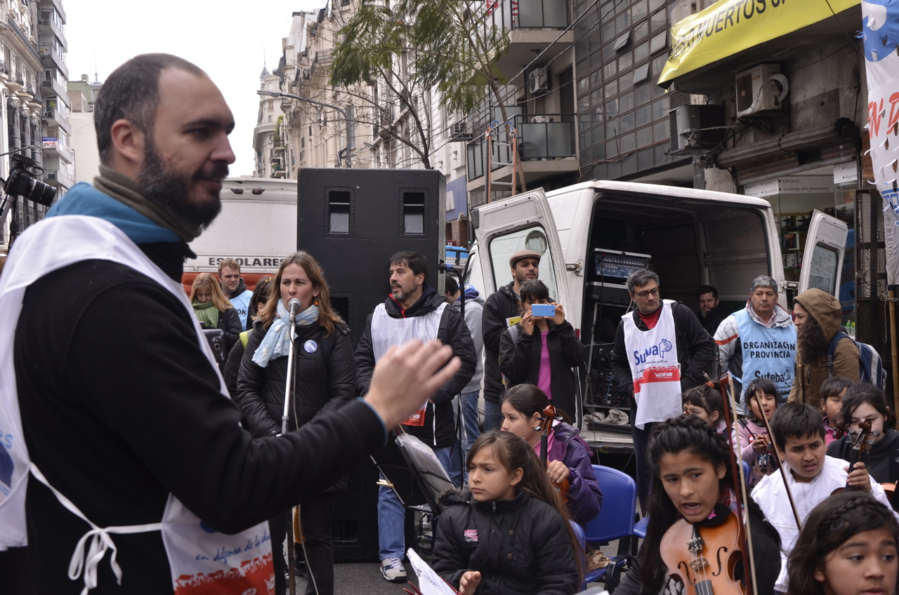 Asimismo, el Secretario General del SUTEBA, Roberto Baradel, tomó la palabra: "Nos movilizamos por la insensibilidad que demuestran el Gobierno Provincial y Nacional, quienes están desmantelando los Programas Socioeducativos. Los chicos pueden dar mucho, hay que agradecerles por los acordes muy bonitos que tocan. Sus papás y nosotros estamos orgullosos de ustedes, como también de sus profesores que construyen Escuela Pública día a día".