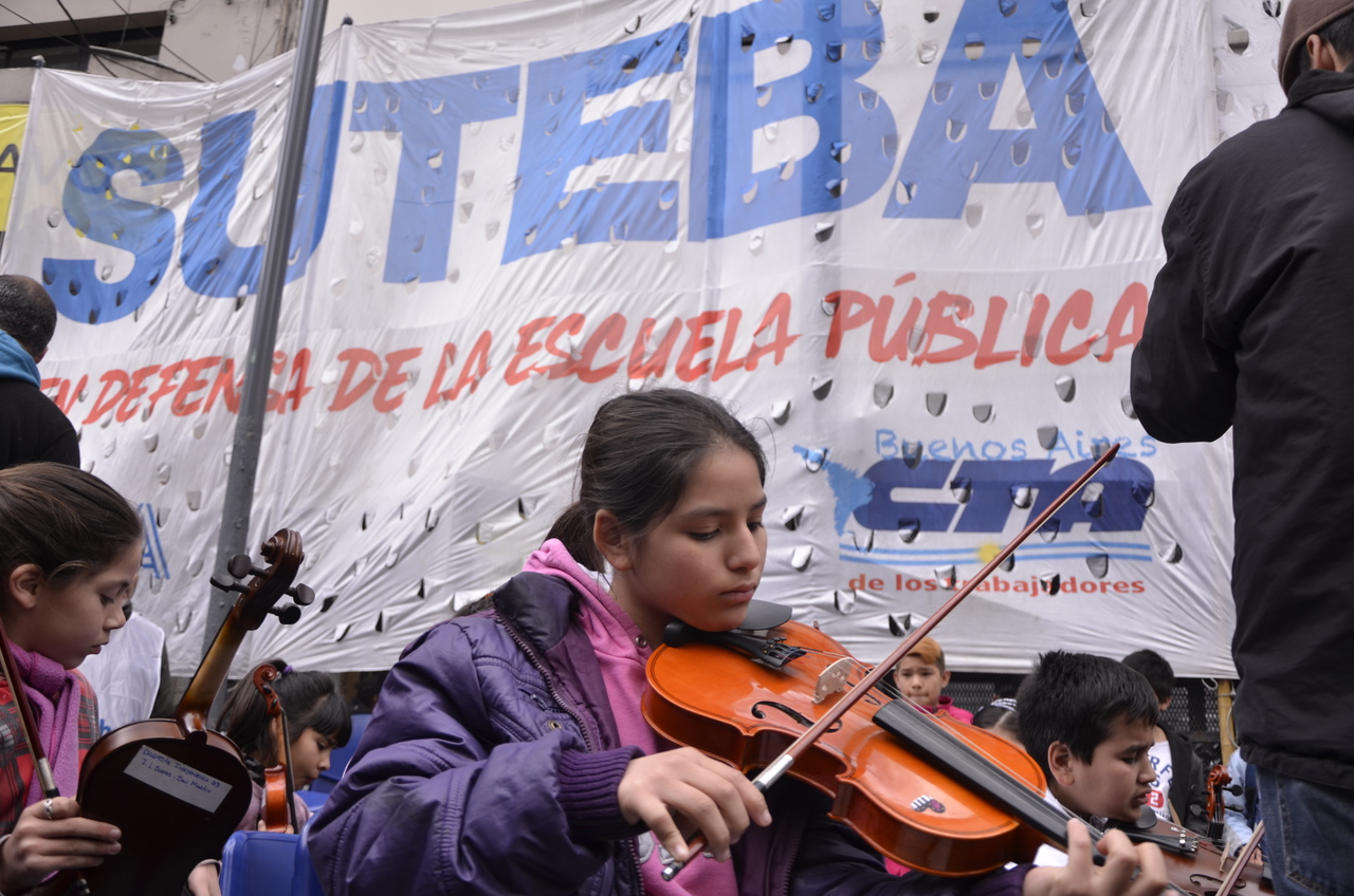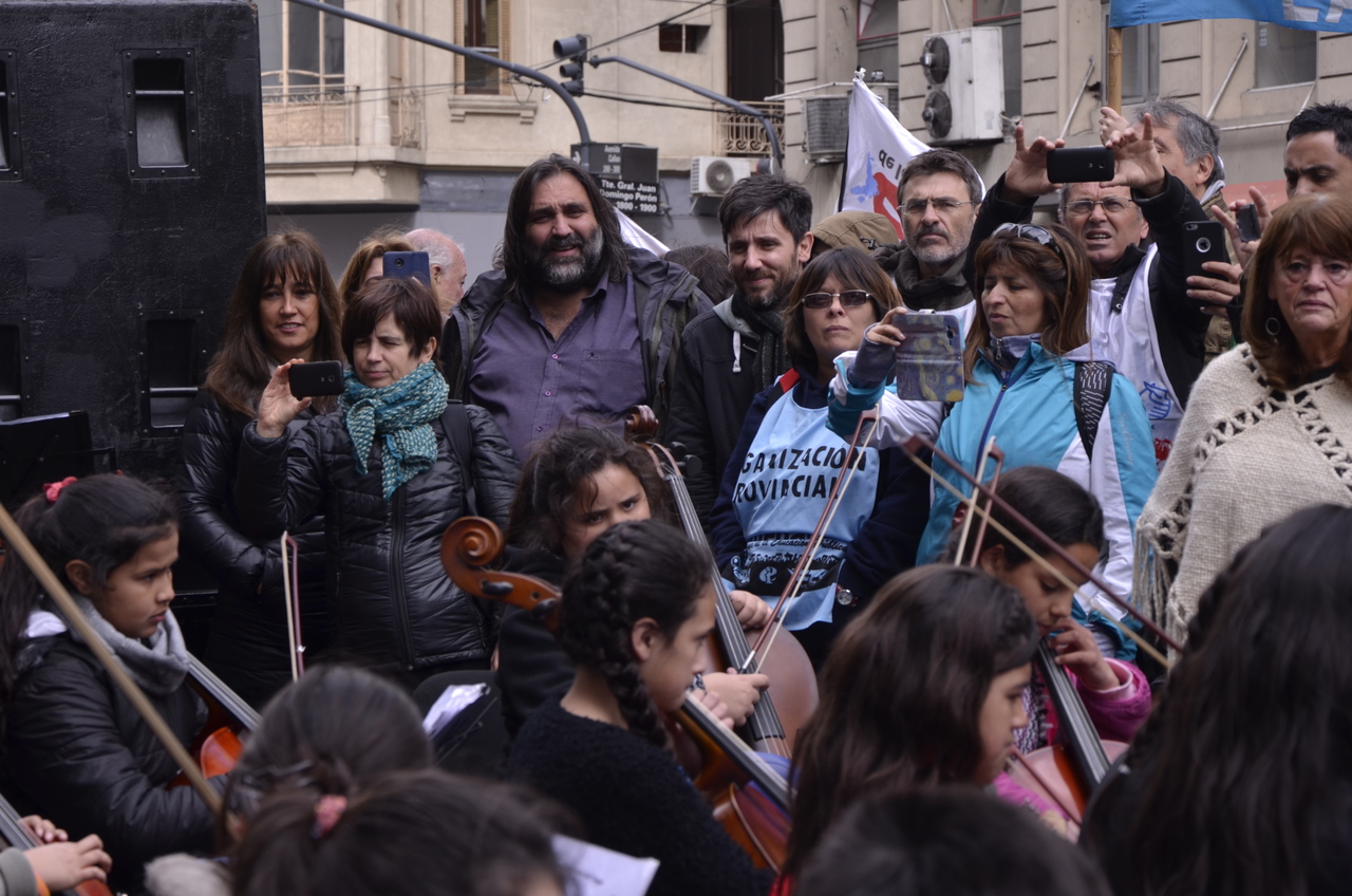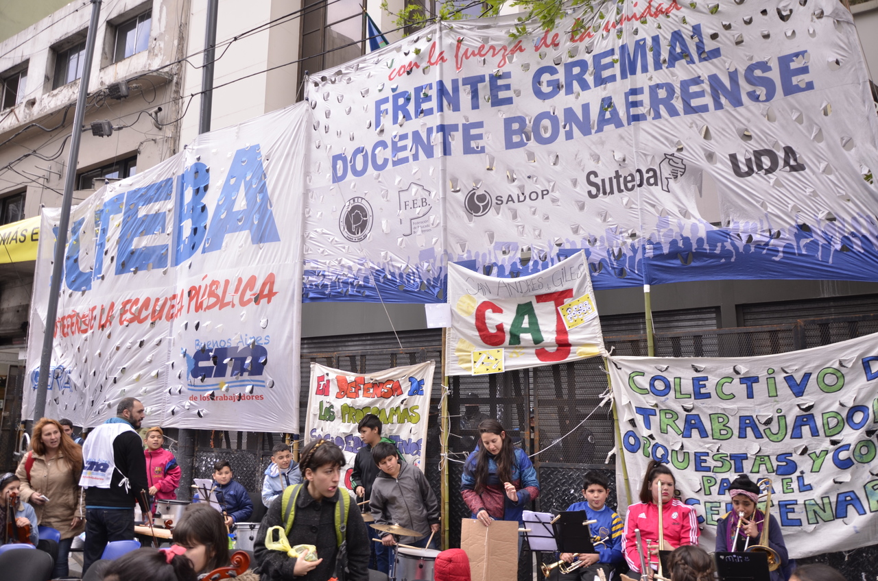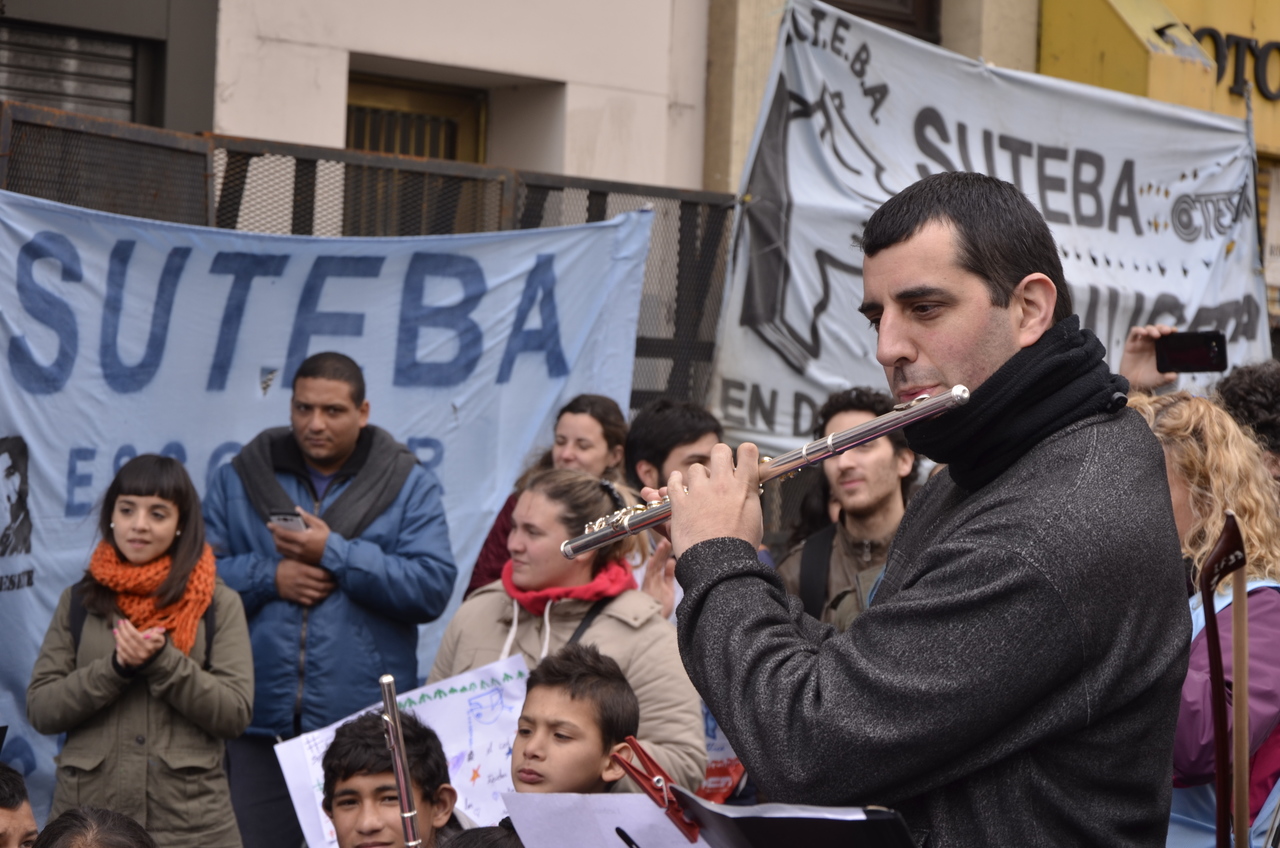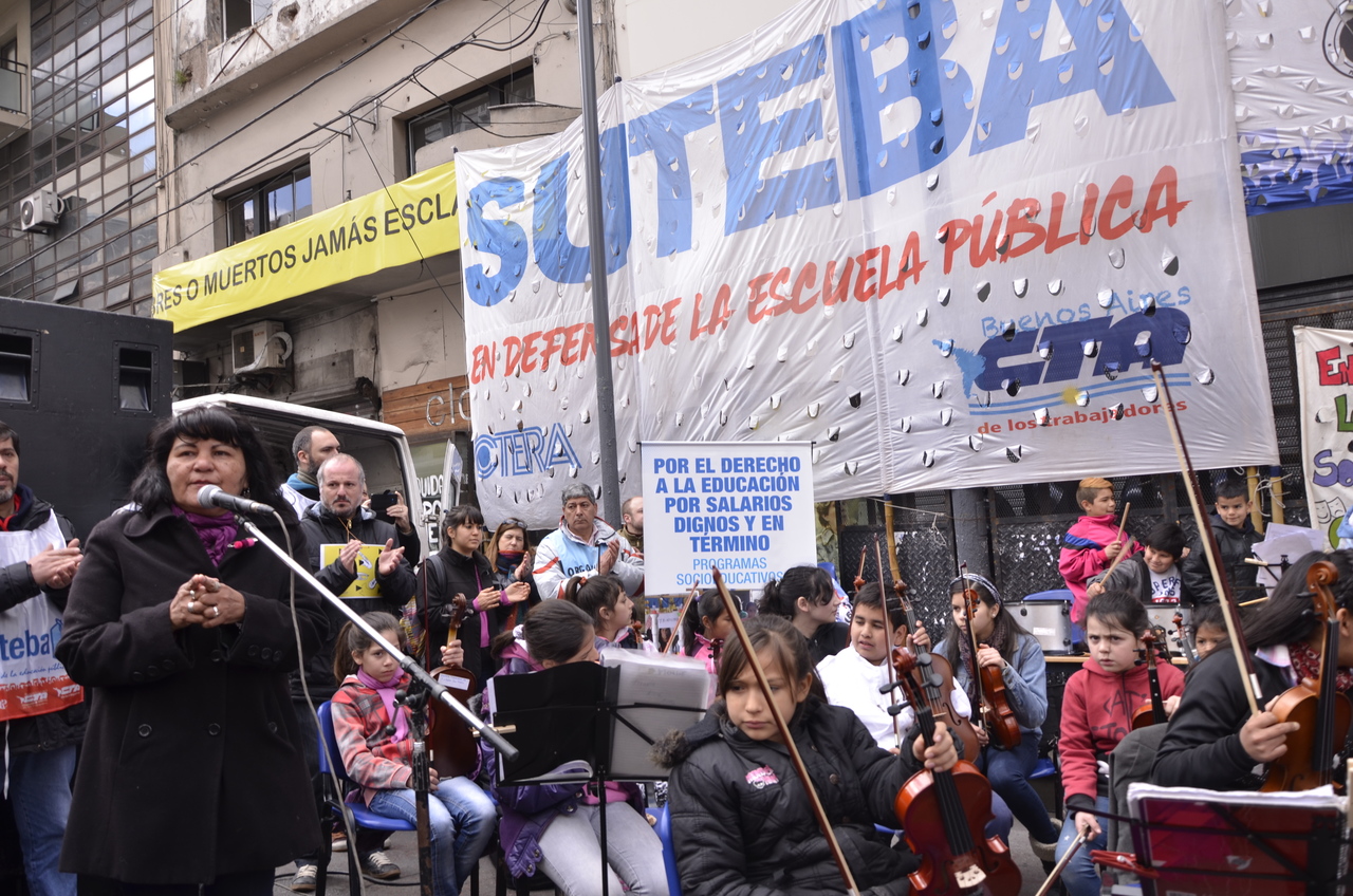 Asimismo, el Secretario General del SUTEBA, Roberto Baradel, tomó la palabra: "Nos movilizamos por la insensibilidad que demuestran el Gobierno Provincial y Nacional, quienes están desmantelando los Programas Socioeducativos. Los chicos pueden dar mucho, hay que agradecerles por los acordes muy bonitos que tocan. Sus papás y nosotros estamos orgullosos de ustedes, como también de sus profesores que construyen Escuela Pública día a día".