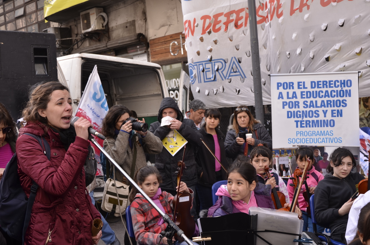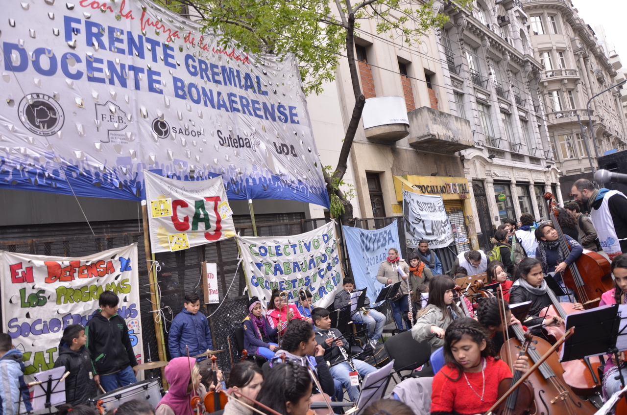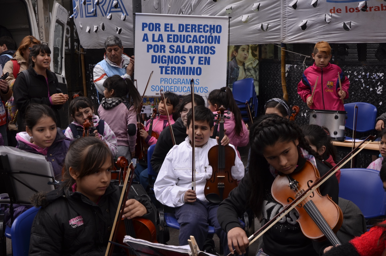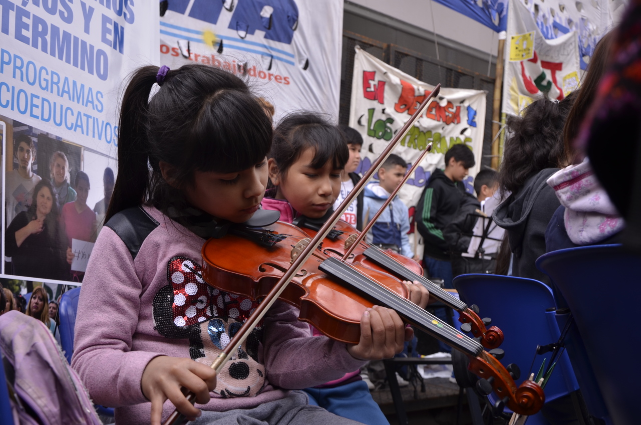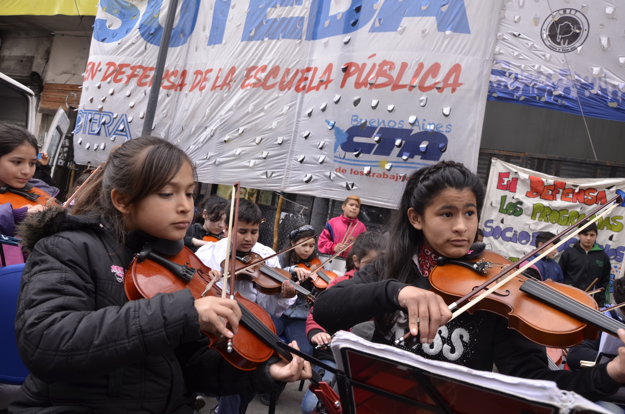 Los chicos le pusieron música a la jornada interpretando canciones con sus instrumentos, dando muestra de lo que aprendieron con estos programas y demostrando lo que puede dar la Educación Pública con Docentes que trabajan en proyectos pedagógicos que incluyen y ponen como marco el ejercicio de derechos. Junto a ellos estaban presentes sus profesores, quienes se hicieron presentes desde distintos puntos de la Provincia para denunciar el vaciamiento que está llevando adelante el Gobierno Provincial de María Eugenia Vidal, responsable también de no pagarles sus salarios en tiempo y forma desde hace seis meses.