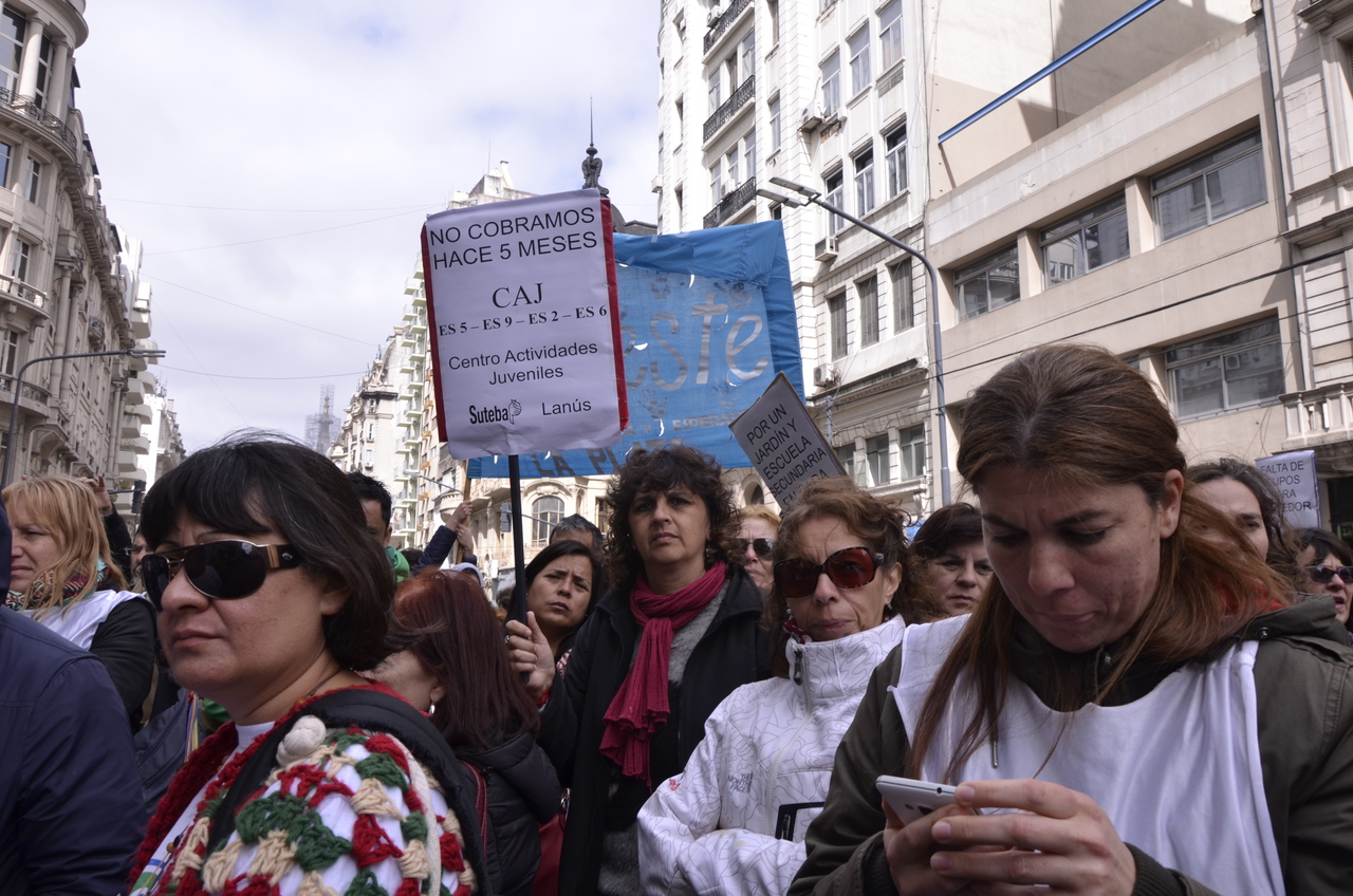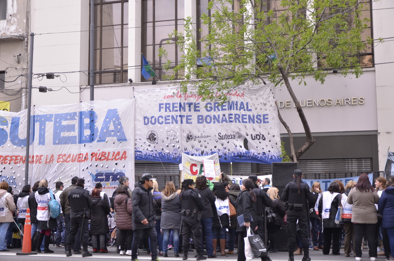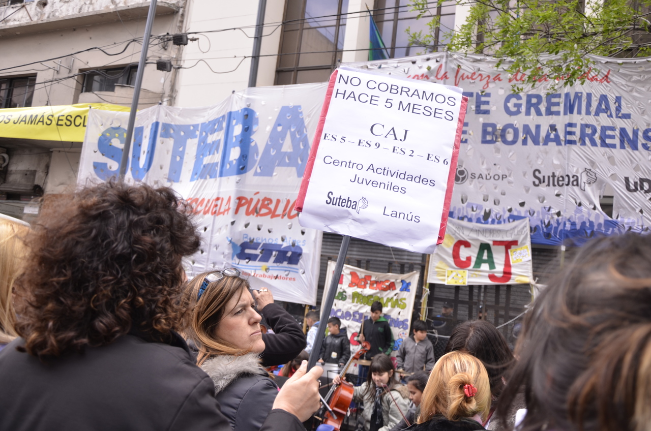 En el marco de la Jornada Provincial de lucha convocada por el FGDB, el SUTEBA se hizo presente frente a la Casa de la Provincia de Buenos Aires para exigir la continuidad de los Programas de Coros y Orquestas del Bicentenario, CAI y CAJ, además exigir el pago de salarios para los docentes que están sin cobrar hace seis meses. Por su parte, la FEB realizó acciones gremiales en Bahía Blanca encabezada por su Presidenta Mirta Petrocini.