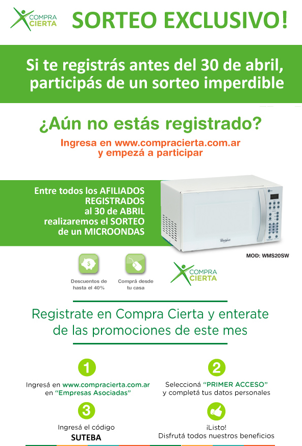 3. Participan de la Promoción todas aquellas personas que se encuentren incluidas dentro de la nómina de SUTEBA (los "Colaboradores") y que, al término del Plazo de Vigencia, se encuentren registrados en el sitio Compra Cierta (el "Sitio") (el/los "Participante/s").