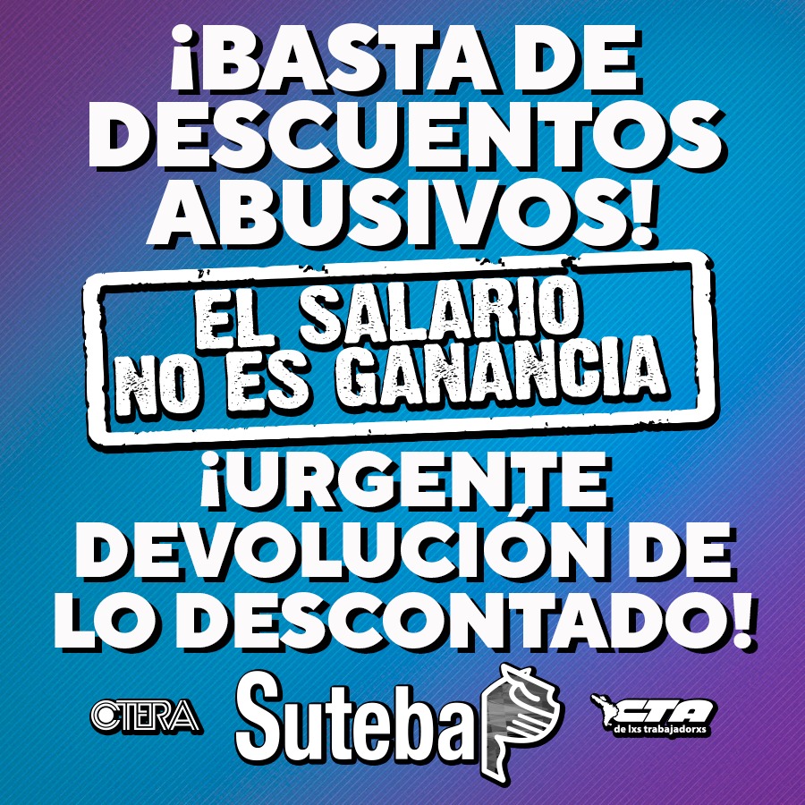 Frente a los descuentos indebidos y abusivos que hoy se detectaron en numerosos salarios de lxs Trabajadorxs de la Educación, cobrando sumas que les impiden sostener sus gastos mínimos y necesarios, desde el SUTEBA exigimos: