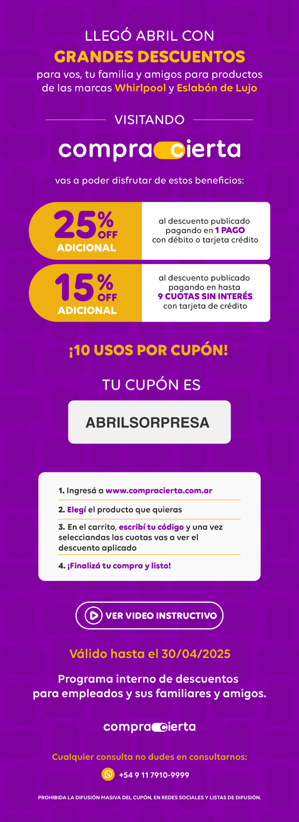 Este cupón va a ser útil al momento de adquirir productos nacionales de diversas marcas, realizando tu compra online a través de www.compracierta.com.ar.