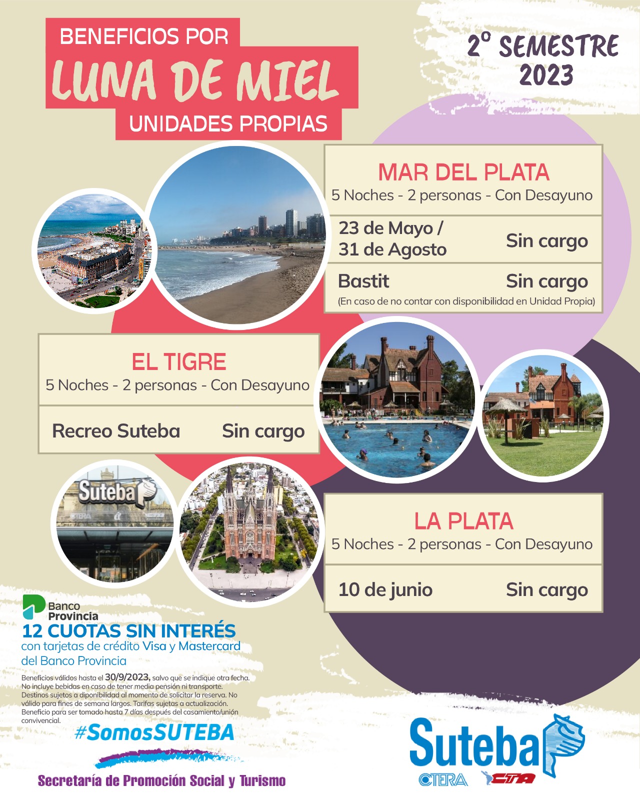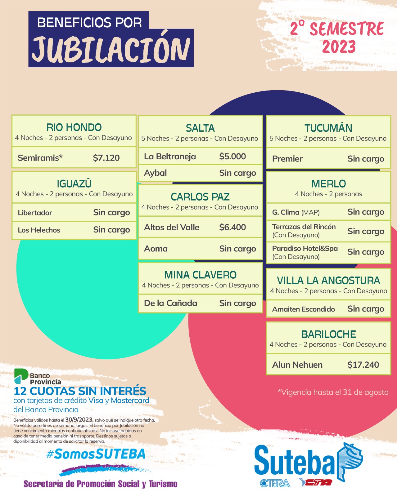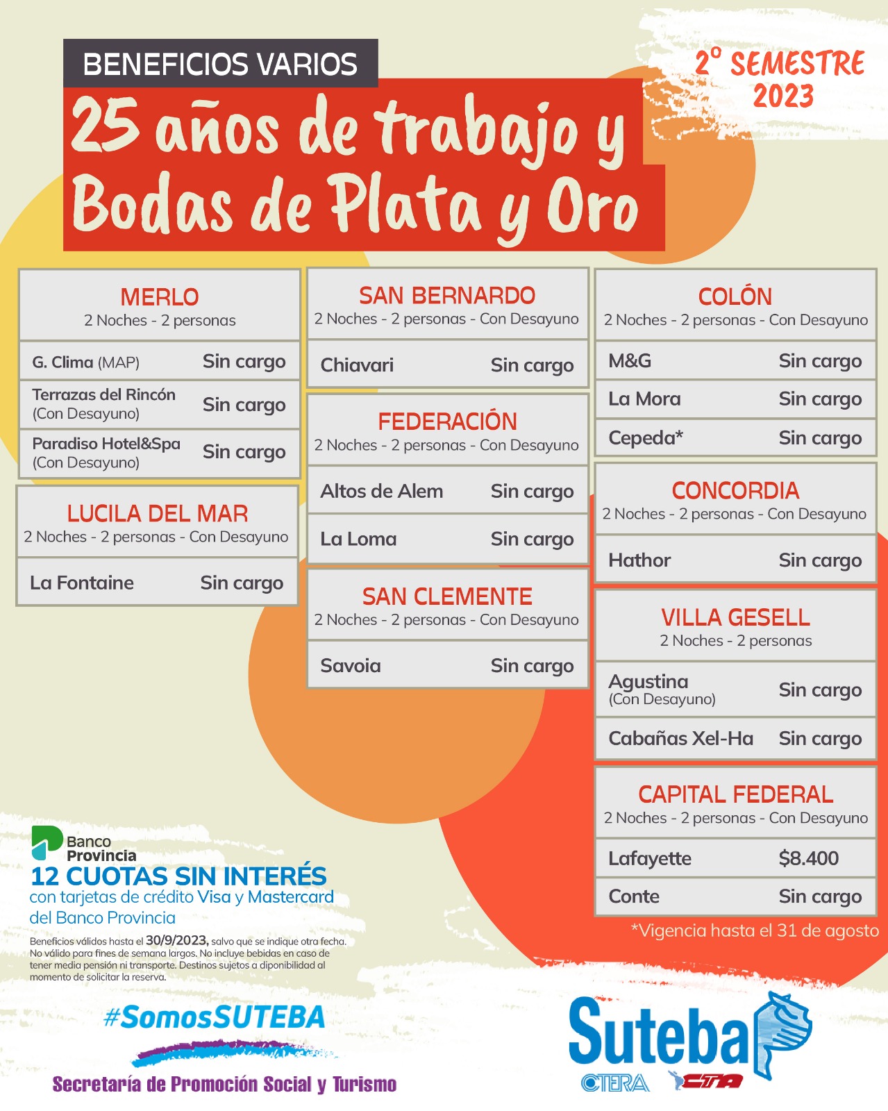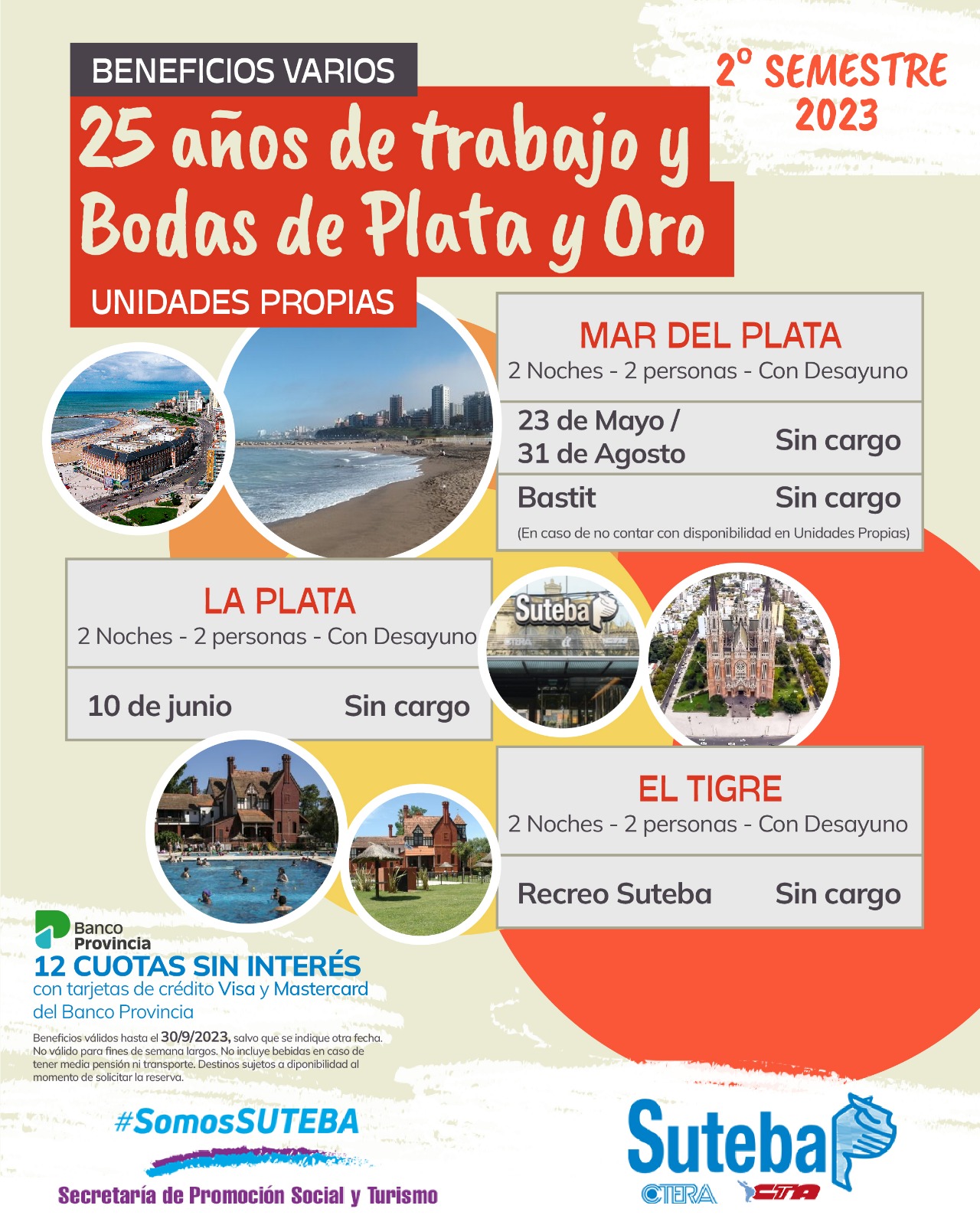 Desde la Secretaría de Promoción Social y Turismo compartimos con todxs lxs afiliadxs los Beneficios de Turismo que pueden elegir durante el segundo semestre del año 2023 para Luna de miel, Jubilación, 25 años de actividad y Bodas de Plata y Oro.