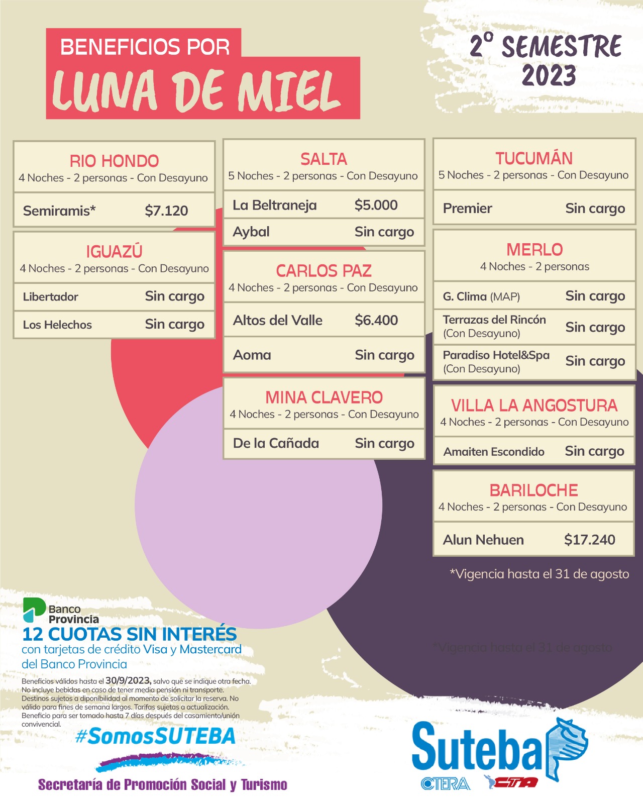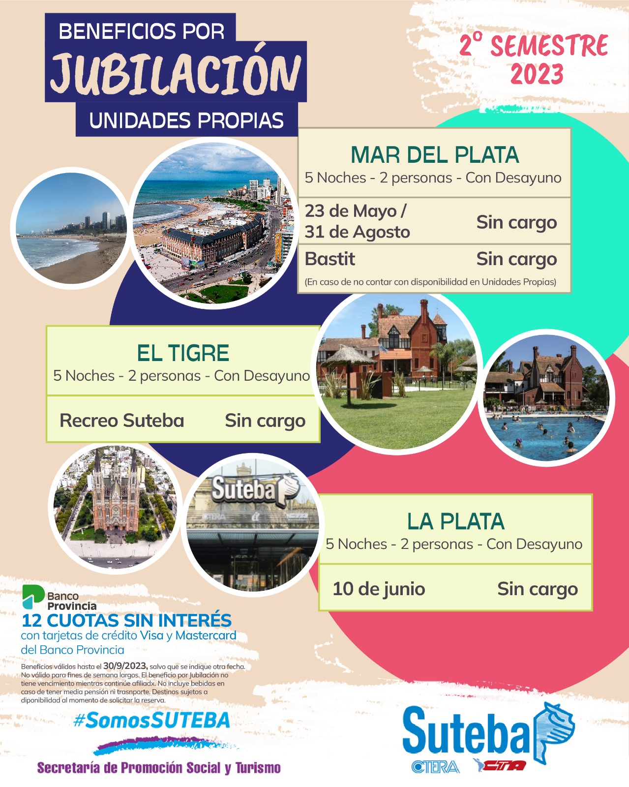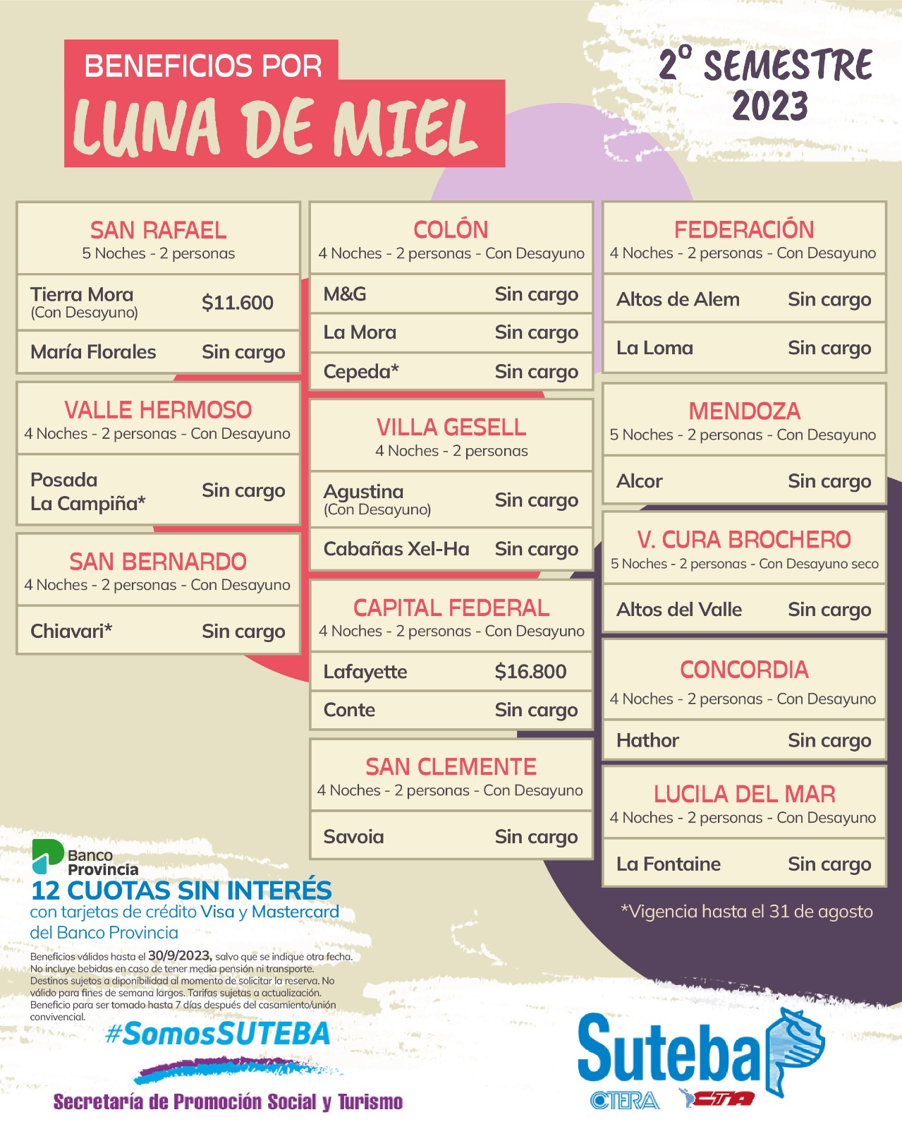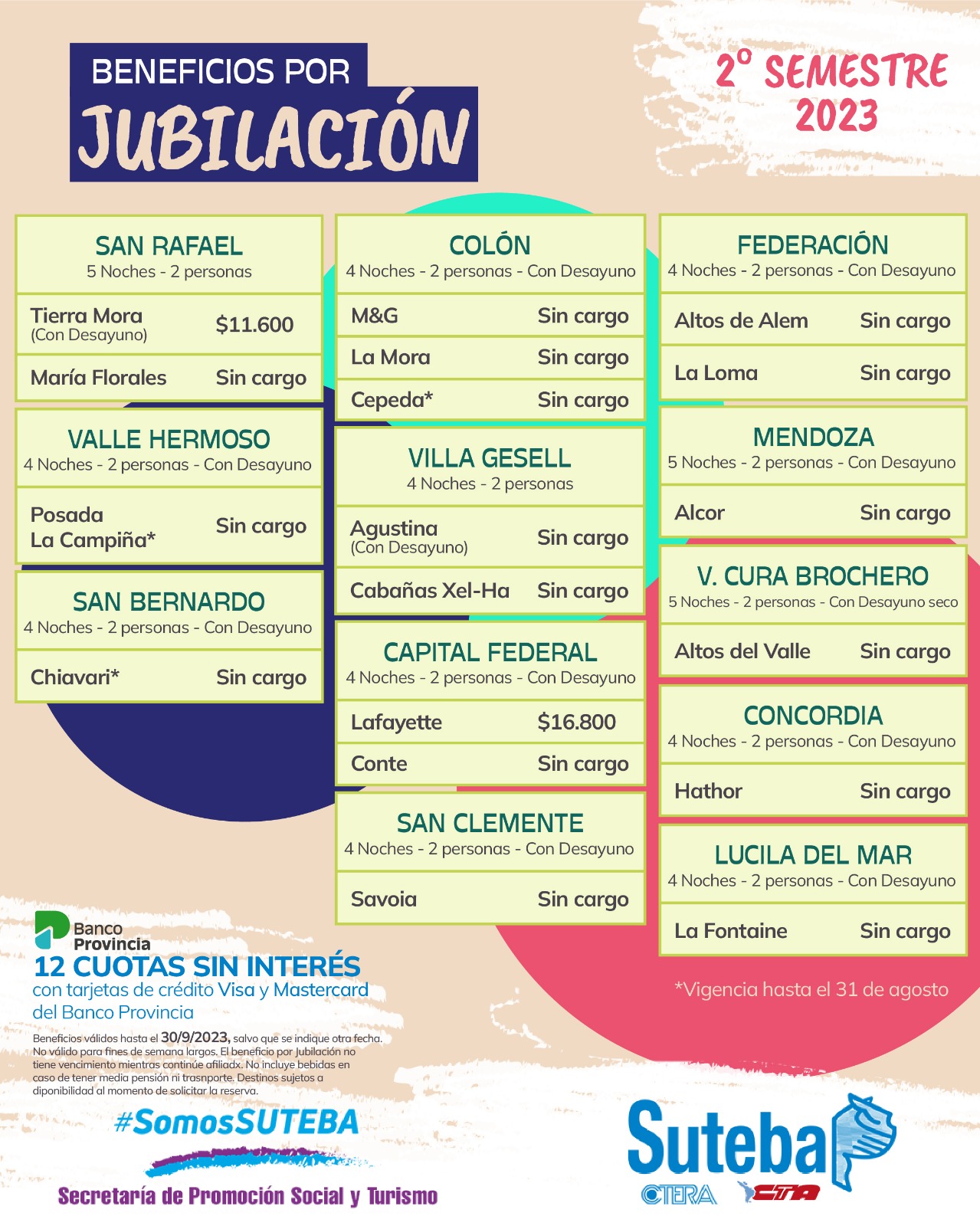 Desde la Secretaría de Promoción Social y Turismo compartimos con todxs lxs afiliadxs los Beneficios de Turismo que pueden elegir durante el segundo semestre del año 2023 para Luna de miel, Jubilación, 25 años de actividad y Bodas de Plata y Oro.