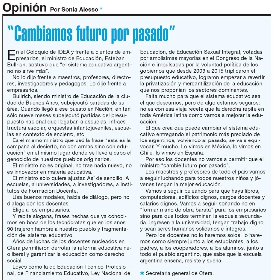 El que crea que puede cambiar el sistema educativo entregando el patrimonio más preciado de los argentinos, volviendo al pasado, se va a equivocar. Y mucho. Lo vimos en México, lo vimos en Chile, lo vimos en España.Por eso los docentes no vamos a permitir que el ministro "cambie futuro por pasado". Los maestros y profesores de todo el país vamos a seguir luchando para todos nuestros niños y jóvenes tengan la mejor educación.