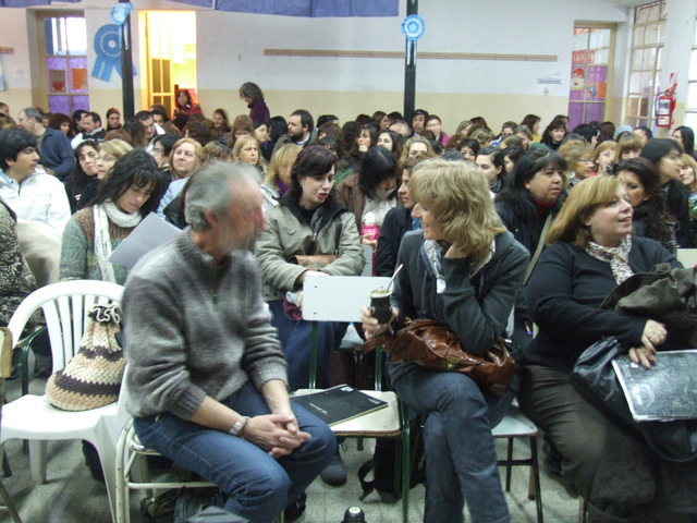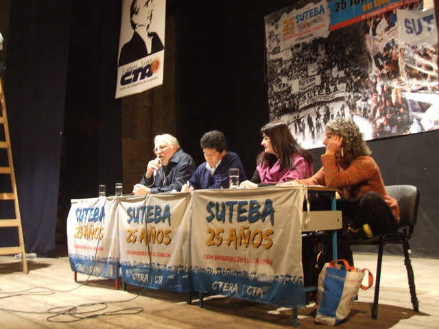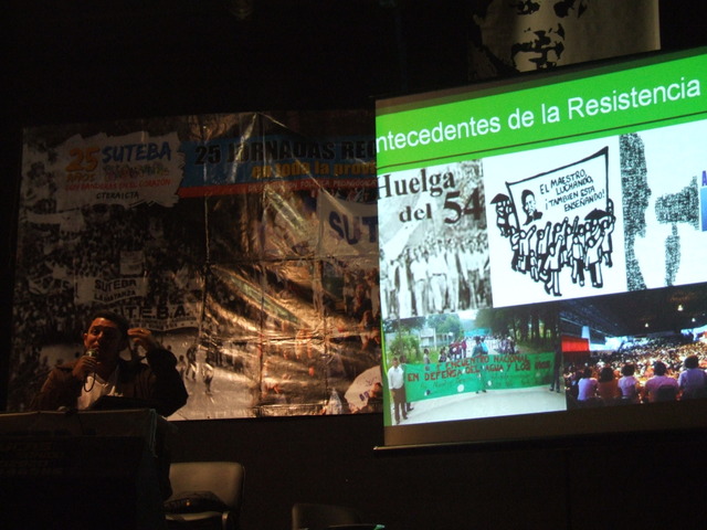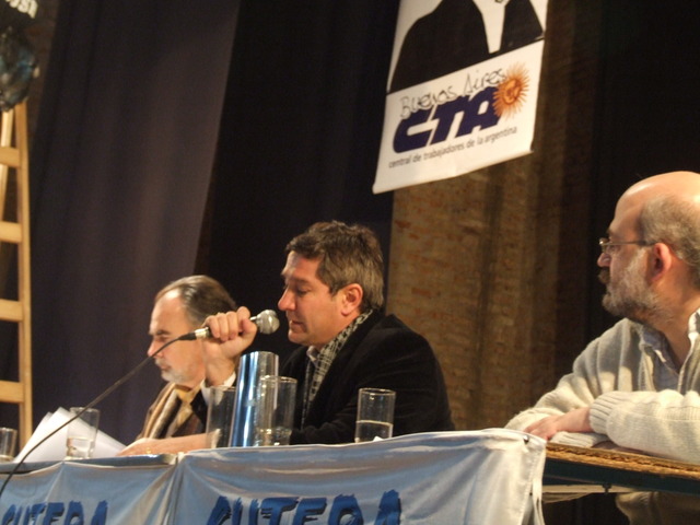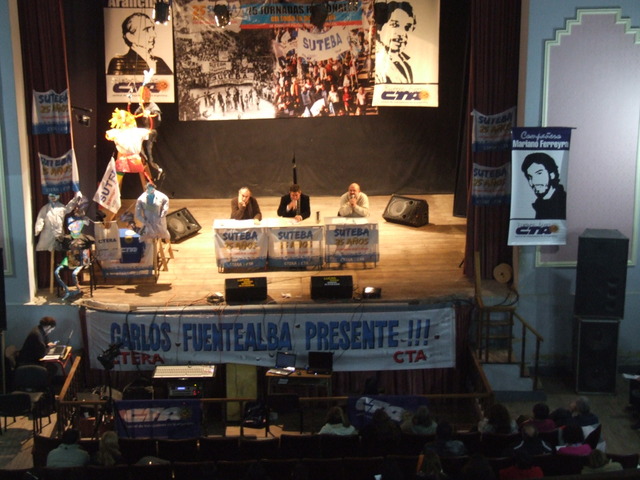 El último en exponer fue Héctor Gonzalez: “Históricamente nuestro trabajo estuvo muy marcado por otras miradas, construidas en los escritorios de los funcionarios, en los escritorios de las academias, incluso en ciertos medios hegemónicos o en organizaciones empresariales u organizaciones que están financiadas por los sectores de poder. Por eso, la propuesta de CTERA y SUTEBA fue construir una mirada nuestra sobre nuestro trabajo, para evitar quedar atrapado o colonizado por esas otras miradas.” Para dar un ejemplo de esto que decía, Gonzalez habló de las pruebas PISA: “Aferrarse a las pruebas PISA para referirse a la mala calidad, es para tratar de instalar y legitimar la idea de que nuestro trabajo (el trabajo docente) es fácil y solamente evaluable a través de los resultados de nuestros alumnos. En esta idea, subyace otra idea más sutil que es la idea de reducir la educación a la tarea que realiza el docente con el alumno. Esta reducción de la educación tiene importantes consecuencias, porque invisibiliza, en primer lugar, todo nuestro proceso de trabajo que realizamos cuando no estamos frente a los alumnos (nuestro trabajo tiene un proceso antes y después de estar con los alumnos). Como está invisibilizado no se nos lo reconoce y no se nos lo paga. Además al reducir esa relación, se invisibiliza también todas las otras relaciones de trabajo que tenemos que hacer (trabajo con los otros docentes, con los padres, etc.) para que efectivamente esa porción de trabajo que hacemos con los alumnos se puedan realizar. La tercera, es que todas las responsabilidades sobre lo que suceda o no, en esa relación queda circunscripta a los integrantes de esa relación. Entonces si no hay buena enseñanza en el aula, la responsabilidad es de los alumnos o del mal desempeño del docente y quedan invisibilizadas todas las otras responsabilidades que están incidiendo en lo que se produce ahí: las políticas educativas, las gestiones, los estamentos del sistema educativo, etc.” Y planteó algunas posibles soluciones: “Para que la escuela pueda llevar adelante un trabajo colectivo de tal complejidad, no basta con el hacer ni la voluntad de los que trabajamos en ellas. Necesita muchas condiciones, pero una imprescindible es tener de un conocimiento lo más específico y preciso posible acerca de esos sujetos concretos con los cuales nosotros cotidianamente trabajamos. Un conocimiento acerca de esas situaciones áulicas. Ese conocimiento necesita una organización escolar que garantice espacios, tiempos y recursos para que los docentes se puedan juntar a debatir, intercambiar y compartir. Necesitamos que la jornada laboral contemple tiempos de trabajo sin los alumnos y abarque el trabajo colectivo.” Finalmente, se despidió: “Debemos entrar al aula convencidos de que es un espacio de producción de conocimiento y de producción cultural. El aula no es el lugar donde se bajan contenidos. Es el lugar donde debemos generar procesos de creación de contenidos.”