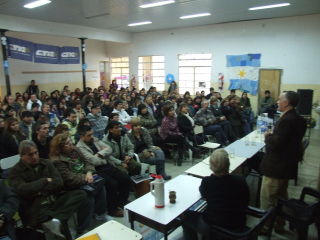 Victorio aportó al debate desde sus experiencias de vida. Dijo que la escuela pública tiene la misma edad que el movimiento sindical en la Argentina y unos y otros han tenido mucho que ver con lo que ha sucedido en nuestra historia y, fundamentalmente, con lo que ha sucedido en el mundo de los trabajadores. Luego, señaló: “El valor de lo que hemos pasado (cárceles torturas exilios) no es el sufrimiento, sino que el valor es la resistencia. Si de resistencia se trata, nosotros tenemos muchísimos ejemplos para mostrar en el conjunto de movimiento social de nuestro país, como por ejemplo Madres y Abuelas, que hicieron cosas que en otros lados no se hicieron, ni se hacen: aparición de 100 nietos, juicio a los genocidas, sentencias a cárcel común, etc.” Habló de los ’90 y dijo: “Este país había sido tomado por el menemismo con un 7% de desocupación y en su mismo período subió al 23%. Y luego, un tercio de la población excluida.” Al mismo tiempo, lo relacionó con la actualidad europea: “Hoy Europa se ha “menemizado”, hoy avanzan sobre los derechos de los trabajadores de la misma forma que avanzaron sobre los nuestros. Esto quiere decir que es algo intrínseco en el sistema capitalista. Y los sindicatos siguen siendo la herramienta principal que tienen los trabajadores a estas políticas.” Celebró el encuentro y concluyó: “Hay que aprovechar a fondo estos espacios de reflexión, ojalá todos los sindicatos en la Argentina tuvieran la posibilidad de reunir a sus bases para hacer estos debates que tienen que ver con la formación, pero que también tienen que ver con la creación de consciencia colectiva de ustedes, los trabajadores de la educación. Para que se involucren cada vez más con su destino colectivo.”