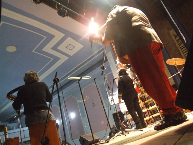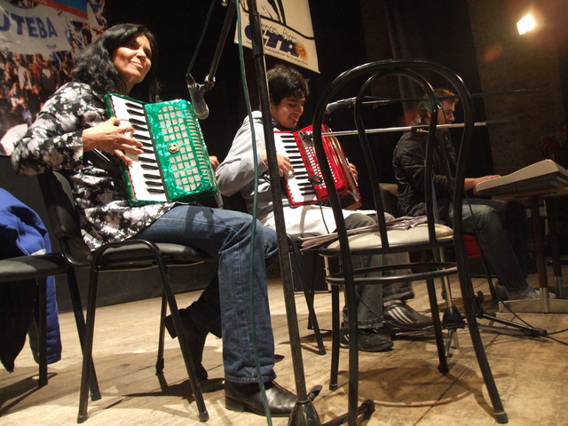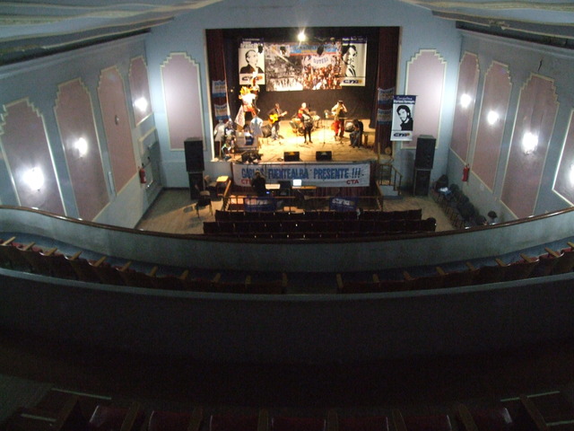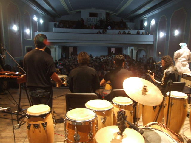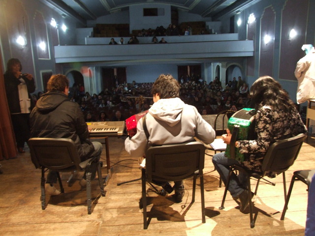 Al entrar al teatro, sobre el escenario se estaba preparando el grupo de percusión de “Patios Abiertos”. Un programa provincial que permite que los chicos utilicen la escuela los sábados para realizar actividades deportivas, artísticas y recreativas. Funciona en la Escuela Nº 2 “Islas Malvinas”.