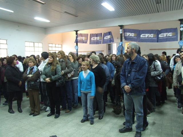 El segundo en hablar fue el Cónsul boliviano, Sixto Valdez Cueto. La misión de Sixto es ver la situación en la que se encuentran lo bolivianos en el sur de nuestro país, ya que hay muchos que se han ido de Bolivia para trabajar aquí, pero lo hacen en pésimas condiciones y quizás de forma ilegal. “Se fueron de Bolivia porque fueron expulsados de su país por un sistema que los despreció,” se entristeció el cónsul. La exposición de Sixto fue una de las más emotivas de la jornada, ya que el compañero contó la historia de su país y su historia personal hasta llegar al punto de emocionarse hasta las lágrimas. “Soy hijo de una obrera que durante más de 40 años fue explotada y no sabía leer ni escribir y cuando yo escribí mi primer libro se lo dedique y ella no lo pudo leer”, contó el boliviano y en ese momento, se le hizo un nudo en la garganta y se le vidriaron los ojos. Le costaba continuar hablando, pero todos los presentes comenzaron a aplaudir y a gritarle palabras de aliento para que el cónsul pudiera seguir compartiendo sus experiencias de vida. “Hoy muchos hermanos bolivianos vienen desde Tierra del Fuego para hacer sus papeles y me cuentan como los explotan, que no saben leer ni escribir y en ese sentido tenemos que trabajar todos, nosotros desde el consulado en conjunto con la CTA y con ustedes,” propuso Valdez. Desde el punto de vista de la comunicación, remarcó: “La profundidad de los pueblos está más allá de las capitales. No todo es lo que se ve en la televisión o en los diarios que, además, no sólo son transmisores de conocimiento, sino gestores de las conciencias de los seres humanos, desde los niños hasta los mayores.” Contó un poco la causa y el compromiso del presidente Evo Morales: “Bolivia ha sido el cuarto país que ha eliminado el analfabetismo. Y eso ha sido gracias a Evo Morales y a Venezuela. Más allá de lo que digan los medios que representan a la derecha, también ha aumentado la presencia de niños en las escuelas.” También dijo que en Bolivia “no ha habido un cambio de gobierno, sino un cambio de sistema”, pero “no con venganza, si con firmeza y con preferencia a los siempre ninguneados.” Para concluir, dijo: “El desafío de los docentes, de ustedes, es sembrar la conciencia del amor a la patria, la organización y la unión.” Al finalizar todo el salón se puso de pie para aplaudir al cónsul y agradecerle el hecho de haberse sincerado tanto.