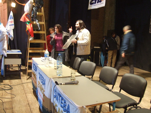 El compañero Casaña presentó un Power Point titulado “La Resistencia como nuevo sujeto político latinoamericano”. El hondureño habló de su experiencia en el sindicato de docentes de honduras, de la clase política, la intromisión estadounidense, el golpe a Zelaya y el momento que atraviesa hoy su país. Habló también de la Federación de Organización Magisteriales de Honduras (FOMH), que son seis sindicatos de educadores unidos en un solo frente de lucha. Habló de la necesidad de superar la crisis:. “Cada uno de nuestros compañeros debe ser un promotor, no para hacer política, sino para politizar al entorno, a nuestra comunidad educativa y producir el cambio social. Los docentes deben generar el debate.” El compañero sintetizó la historia de su país usando a Rafael Heliodoro Valle y Roberto Sosa, dos de los intelectuales más lúcidos de Honduras. El primero, hace un tiempo fue el creador de la frase: “La historia de Honduras puede escribirse en una lágrima”. Hoy, -agregó- Roberto Sosa, recientemente fallecido, le respondió a Heliodoro Valle: “La historia de Honduras puede escribirse en una gota de sangre.” Además, abordó los sucesos ocurridos desde los años ’80 en adelante: “En Honduras, tuvimos un fenómeno difícil en los 80. Nuestros máximos líderes que se habían preparado para la lucha fueron asesinados: Manfredo Velazquez, al padre Guadalupe Carnei, y los que quedaron vivos muchos de ellos se alinearon, otros bajaron su perfil, otros hicieron carrera política pero fueron absorbidos por los grandes partidos y dejaron de representar las exigencias del pueblo y fueron víctimas del bipartidismo. La desmoralización y la desarticulación de la clase obrera, con los principales dirigentes muertos y otros acomodados, caló en la médula de los nuevos obreros durante la década de los 90. No obstante, procesos políticos producidos por la misma crisis sistemática como, el Caracaso, en 1989, el Argentinazo, en 2001, entre otros, nos marcaron la cancha, y hoy sabemos que tenés que definirte de qué lados estás.” A diferencia de la Argentina, en Honduras tuvieron su primer estatuto docente en 1997. En 2008, la Coordinadora Nacional de la Resistencia Popular (CNRP) le llevó los 12 puntos (donde resumían la demanda del pueblo hondureño) a Zelaya, quien en ese momento “ya había roto toda las relaciones con la oligarquía hondureña y se había acercado a los movimientos populares.” “Nos queda totalmente claro que la oligarquía golpista y la burguesías en general, jamás renunciaran a sus privilegios sin ofrecer batalla por todos los medios posibles incluyendo el asesinato y la tortura. La sociedad hondureña está definida, sabe quien es explotador y además sabe que no hay otro camino que el de la revolución, sobre los principios de igualdad, justicia en todos los campos y solidaridad”, reflexionó Casaña. También celebró la unión de ambos países diciendo: “Somos hermanos luchadores que tenemos vidas paralelas en diferentes lugares pero con las mismas ganas de salir adelante.” Hoy, en Honduras, los movimientos se encuentran amenazados por la cooptación de procesos populistas o de frentes populares, partidarios de una reconciliación que en la lucha de clases no tienen cabida, al ser intereses antagónicos y por tanto irreconciliables. Es por eso, que “sostenemos que no tenemos posibilidad ni de sobrevivir, si no unificamos las luchas y nos cobijamos bajo las banderas de la independencia de clase”, indicó el hondureño. Por último, agradeció a Hugo Yasky, a la CTA, a CTERA y al SUTEBA por la lucha y el apoyo a la resistencia hondureña.