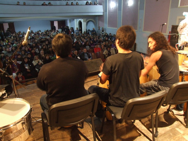 Al entrar al teatro, sobre el escenario se estaba preparando el grupo de percusión de “Patios Abiertos”. Un programa provincial que permite que los chicos utilicen la escuela los sábados para realizar actividades deportivas, artísticas y recreativas. Funciona en la Escuela Nº 2 “Islas Malvinas”.