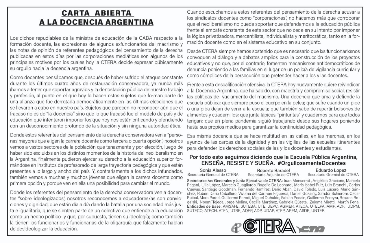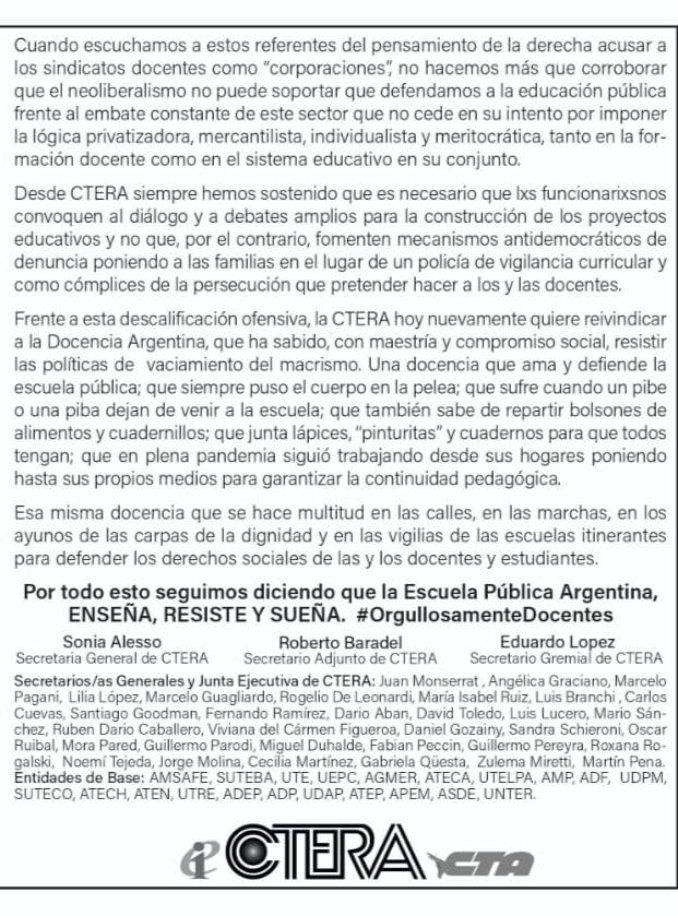 Solicitada de CTERA en respuesta a los agravios de Soledad Acuña, publicada domingo 22 de noviembre, en Página 12, Tiempo Argentino y El Cohete a la Luna.