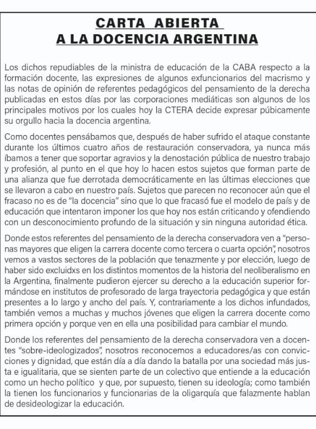 "CARTA ABIERTA A LA DOCENCIA ARGENTINA"