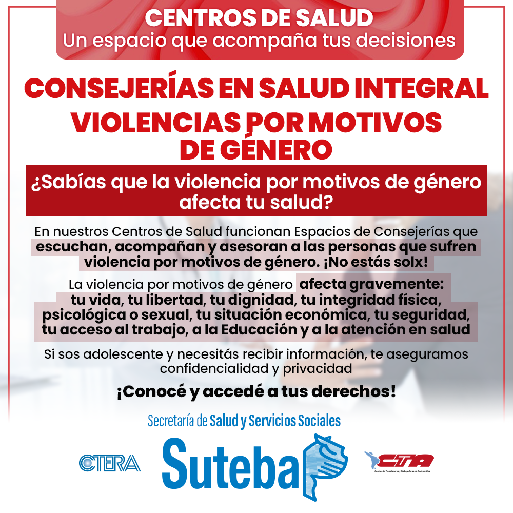 Si estás atravesando alguna situación de violencia basada en el género, podés acercarte al Espacio de Consejerías de los Centros de Salud del SUTEBA, donde el equipo te va a escuchar, brindar asesoramiento.
