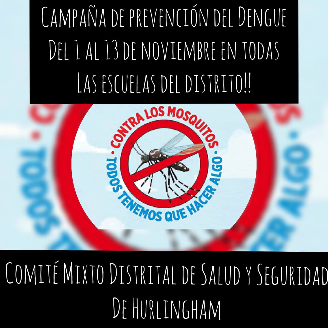 Continuando con este objetivo, el Comité Mixto Distrital de Salud y Seguridad de Hurlingham está llevando adelante, a partir del 1º y hasta el 13 de noviembre de 2021, una campaña en todas las Escuelas sobre prevención del Dengue, haciéndoles llegar un video y un flyer con la Recomendación Nº 1/20 del CMD sobre el Dengue, basada en la recomendación de la CJM.