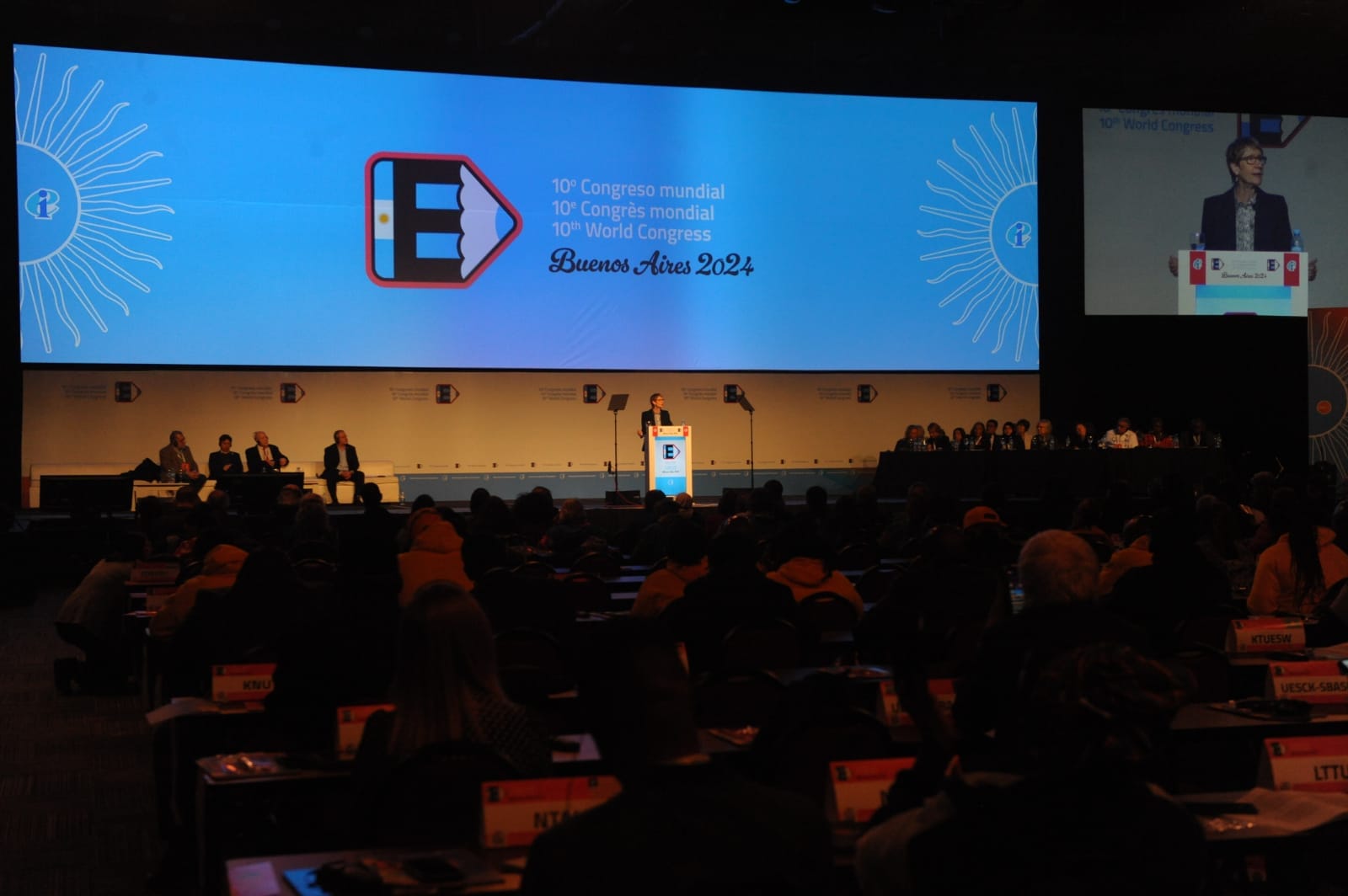 "Le damos la bienvenida a todas y todos los docentes a este Congreso Mundial que será para fortalecer la educación pública en Argentina, América Latina y el mundo.