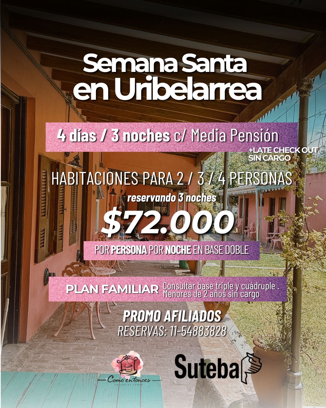 En esta Semana Santa, SUTEBA tiene una promoción exclusiva para sus afiliadxs y su grupo familiar en Uribelarrea, contratando directamente con la Posada de Campo "Como Entonces".